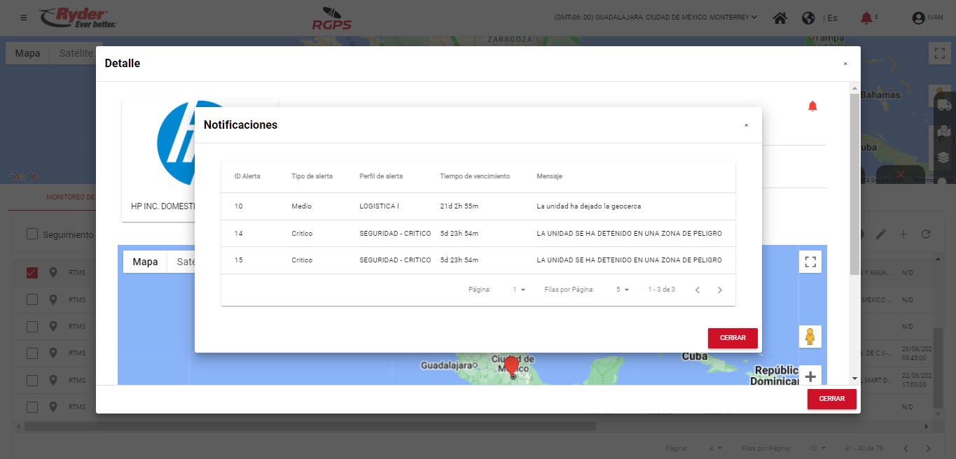 El usuario podrá dar clic en el botón [Cerrar] y/o dar clic en el icono [X] del modal "Notificaciones" y el usuario permanecerá en el modal “Detalle”.