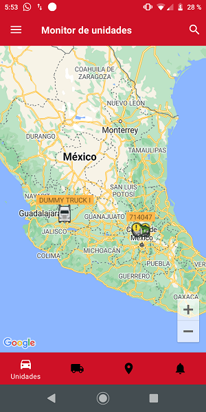 Tras haber iniciado sesión de manera exitosa a la aplicación móvil y si el perfil del usuario autenticado cuenta con el permiso a "Monitor de unidades" se mostrará como pantalla principal “Monitor de unidades” en donde se visualizará un mapa con las unidades asignadas que son seleccionadas en "Unidades asignadas".