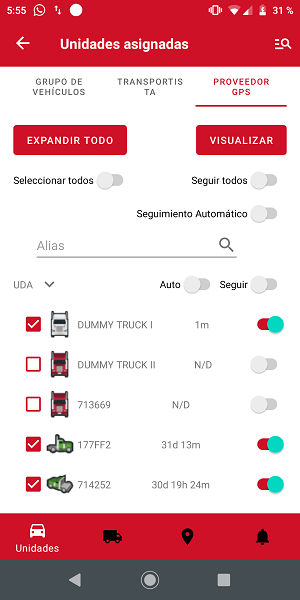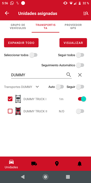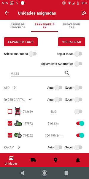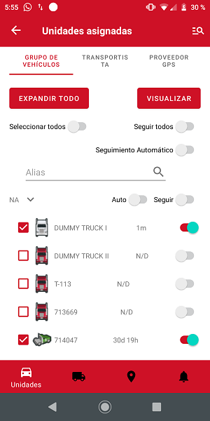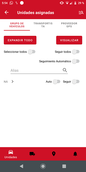 Al encontrarse en la pantalla de "Monitor de unidades", el usuario deberá presionar sobre el icono "Buscar" posicionado en la parte superior derecha y se mostrará la pantalla "Unidades asignadas". Se visualizará el listado que contendrá el listado de las unidades asignadas al usuario autenticado en la aplicación móvil mostrándose agrupadas en Grupo de vehículos, Transportistas y Proveedor GPS.