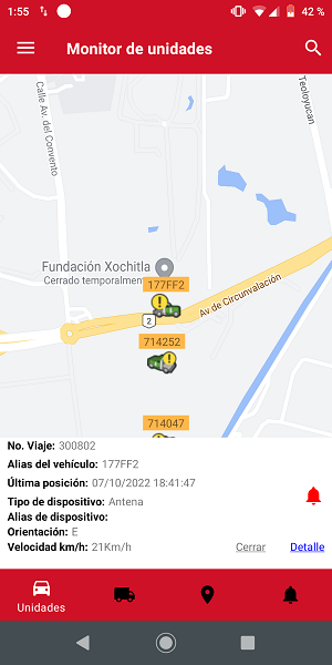 En caso de que el usuario no deseé realizar la consulta del detalle, deberá presionar el icono "Atrás" ubicado en la parte superior izquierda o en la tecla "Regresar" por default en los dispositivos Android y el usuario permanecerá en la pantalla “Monitor de unidades".