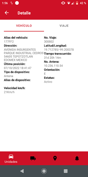 NOTA: Si no se cuenta con un viaje activo asociado a la unidad cada uno de los campos se mostrará sin información.
