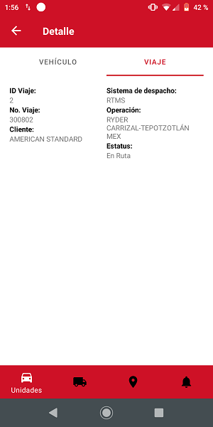 En caso de que la unidad cuente con un viaje activo asociado se encontrará información en la pestaña "Viaje", en donde el usuario podrá presionar y se mostrarán los datos siguientes: