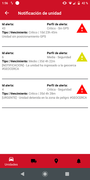 En caso de que el usuario no deseé realizar la consulta de las alertas, deberá presionar el icono "Atrás" ubicado en la parte superior izquierda o en la tecla "Regresar" por default en los dispositivos Android y el usuario permanecerá en la pantalla “Monitor de unidades".