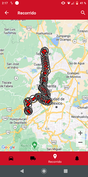 En caso de que el usuario no deseé realizar o concluir la visualización del recorrido en mapa, deberá presionar el icono "Atrás" ubicado en la parte superior izquierda o en la tecla "Regresar" por default en los dispositivos Android y el usuario permanecerá en la pantalla “Recorrido" en donde se visualizarán los registros de la búsqueda aplicada junto con el registro consultado.