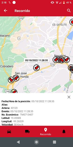 En caso de requerir un detalle de alguna posición, el usuario deberá realizar un zoom sobre el mapa donde se encuentra trazado el recorrido y posteriormente presionar sobre la posición de su interés. Se desplegará de la parte inferior de la pantalla un tablero informativo a modo de resumen que mostrará los siguientes datos: