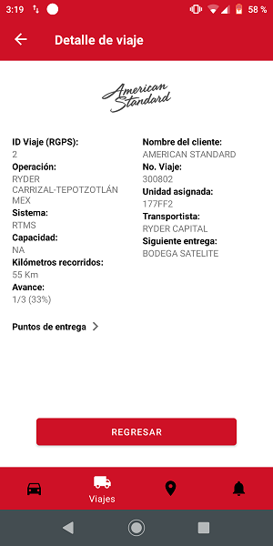 En caso de que el usuario no deseé realizar la consulta del detalle del punto de entrega, deberá presionar en el botón [Regresar] o el icono "Atrás" ubicado en la parte superior izquierda o en la tecla "Regresar" por default en los dispositivos Android y el usuario permanecerá en la pantalla “Detalle de viaje".