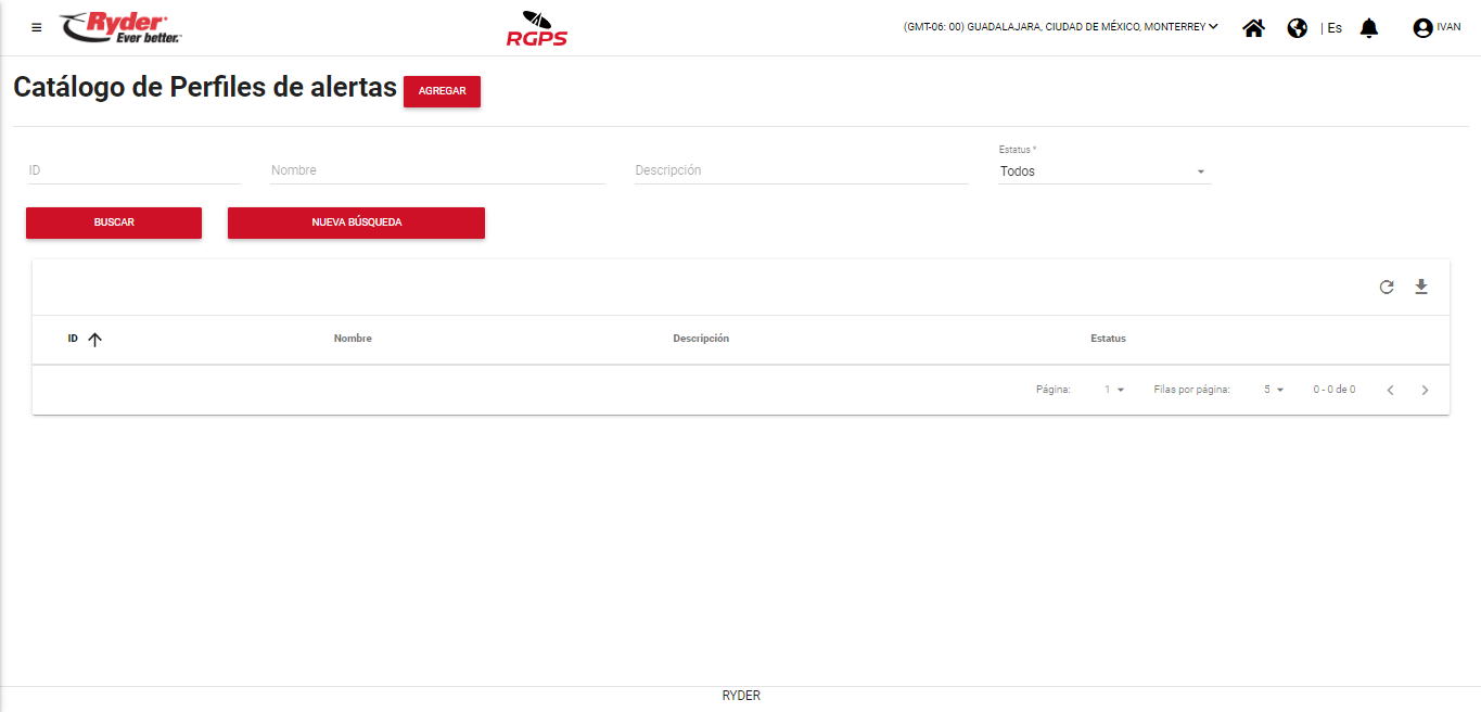 El usuario deberá dar clic sobre la opción [Perfiles de alertas] y se mostrará la pantalla “Catálogo de Perfiles de alertas” en donde se visualizará el listado vacío hasta que el usuario aplique una búsqueda en los filtros y/o accione al botón [Buscar] sin haber aplicado un filtro.