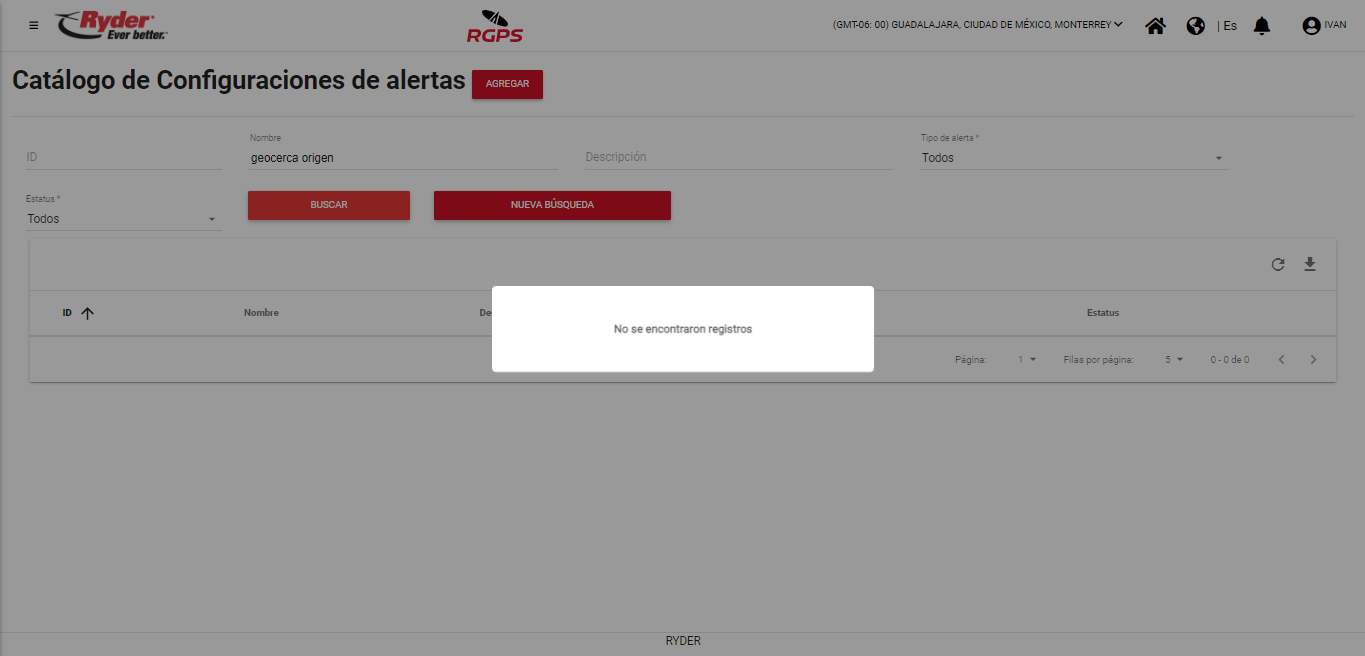 En caso de realizar la búsqueda de una configuración de alerta que no se encuentre registrada en el sistema, al dar clic en el botón [Buscar] se mostrará el siguiente mensaje: “No se encontraron registros”. El mensaje desaparecerá de manera automática tras un par de segundos y el usuario permanecerá en la pantalla correspondiente donde se mostrará lo que fue capturado/seleccionado en los filtros correspondientes. El usuario podrá dar clic en el botón [Nueva búsqueda] para limpiar la información capturada/seleccionada y poder aplicar una nueva.