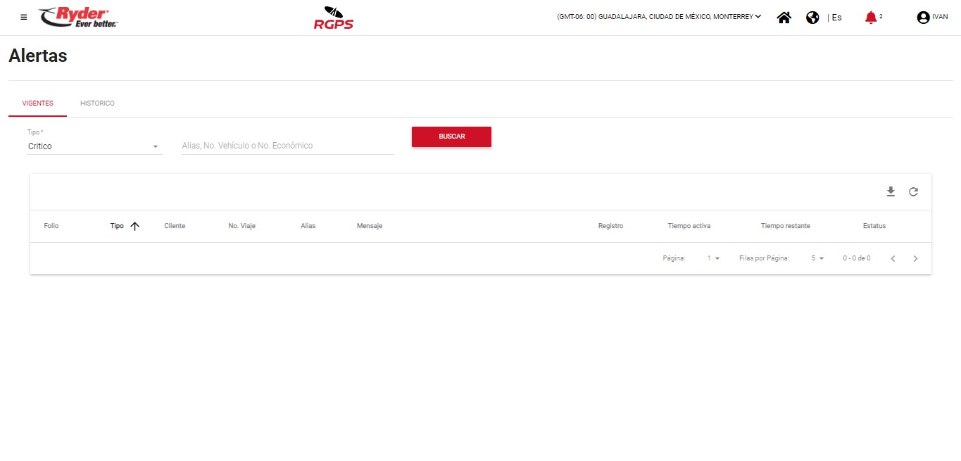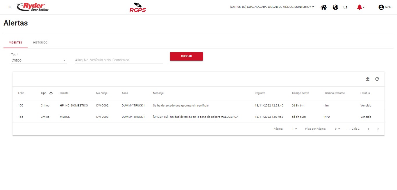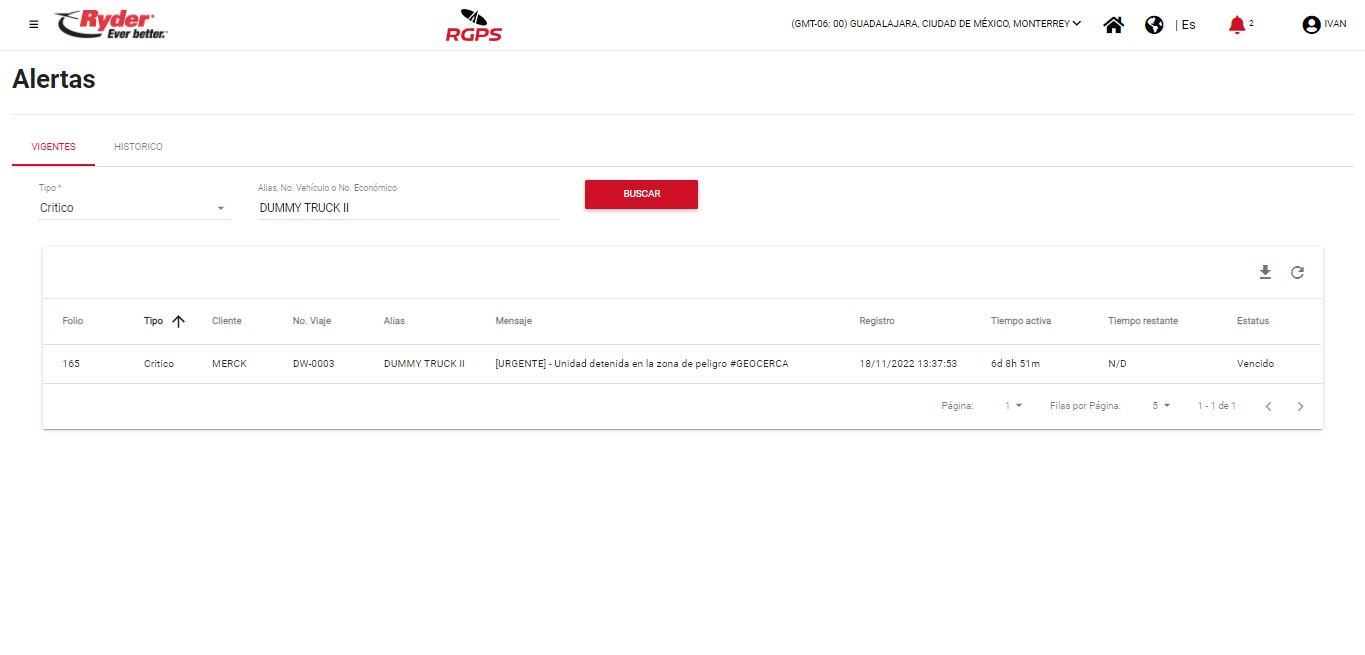 - Cliente. Indicará el nombre del cliente en caso de que la alerta generada se haya encontrado asignada en un viaje activo.