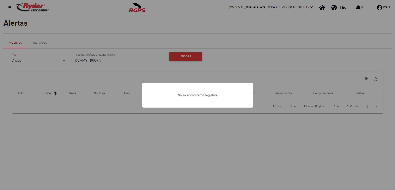 En caso de realizar la búsqueda por tipo, alias, número de vehículo o número económico que no tengan registrada en el sistema ninguna alerta, al dar clic en el botón [Buscar] se mostrará el siguiente mensaje: “No se encontraron registros”. El mensaje desaparecerá de manera automática tras un par de segundos y el usuario permanecerá en la pantalla correspondiente donde se mostrará lo que fue capturado/seleccionado en los filtros correspondientes.