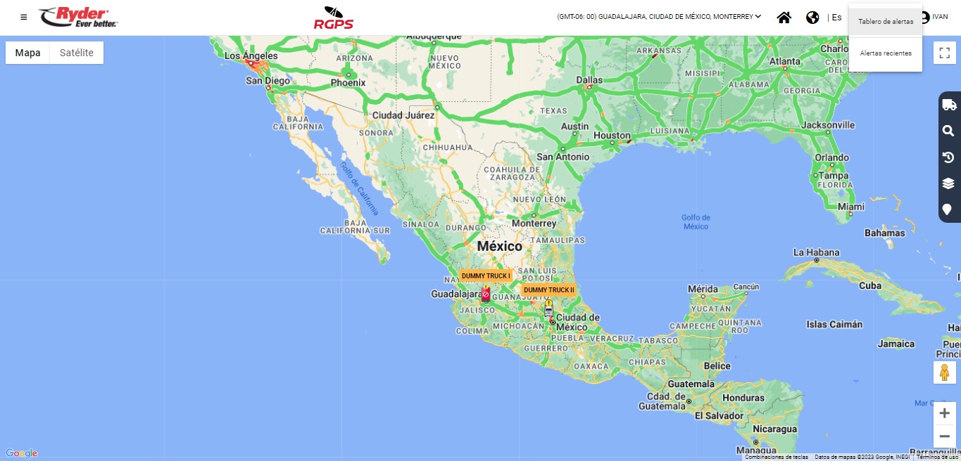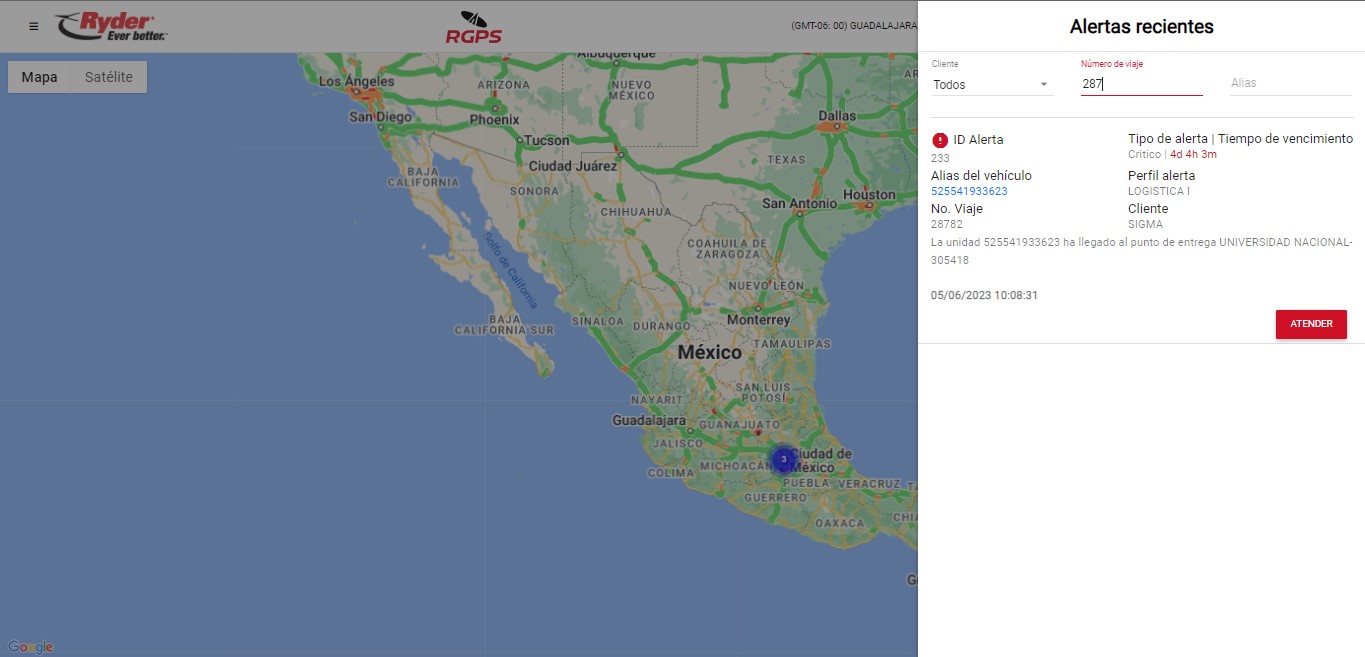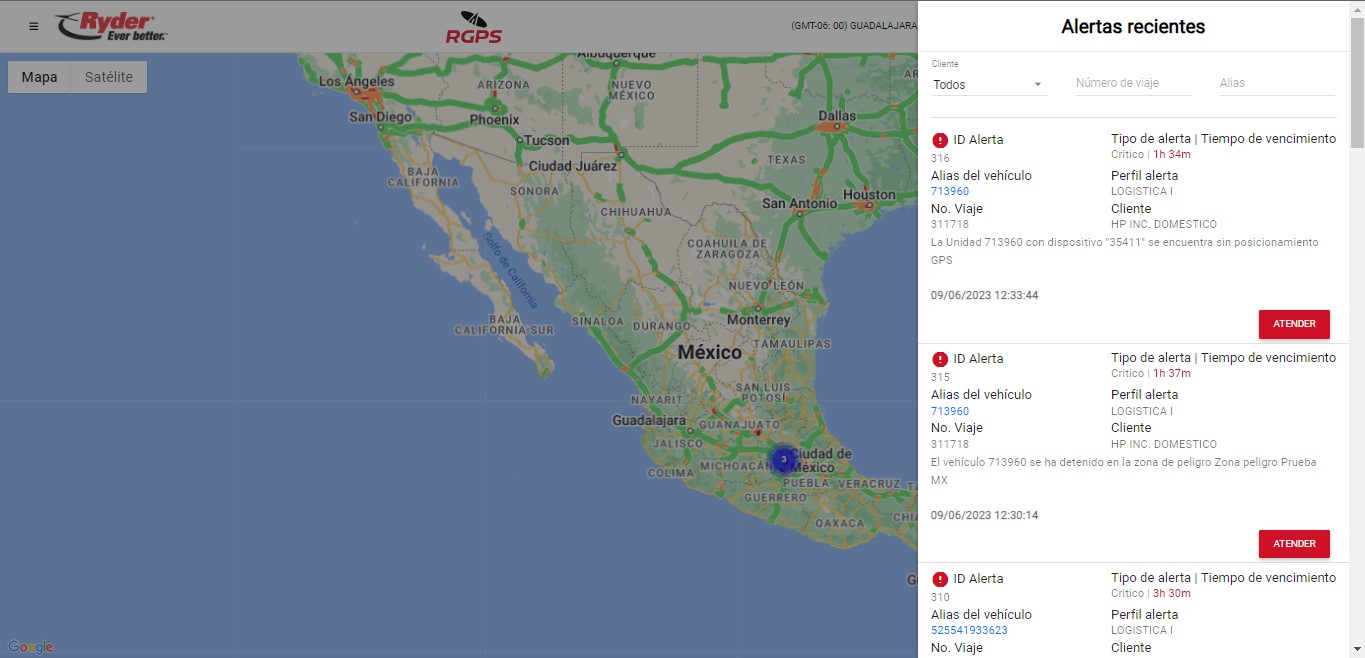El usuario deberá dar clic en la opción "Alertas recientes" y se desplegará del lado derecho una barra lateral de "Alertas recientes" la cual mostrará ordenado del más reciente al más antiguo cada una de las notificaciones conforme a los perfiles y configuraciones de alertas establecidos, tomando en cuenta los eventos/alertas reportadas por el proveedor GPS y/o alertas propias del sistema. De cada registro se mostrarán los datos siguientes: