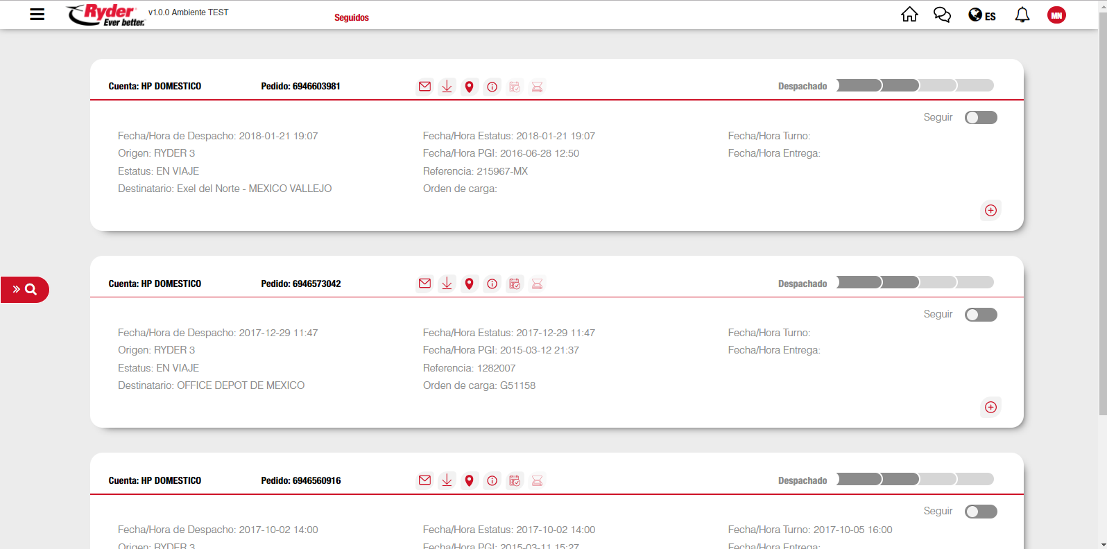 Al encontrarse posicionado en la pantalla principal de los pedidos seguidos, el usuario deberá dar clic sobre logo ubicado en la esquina superior izquierda. Se mostrará pantalla principal del sistema "Track & Trace Web".