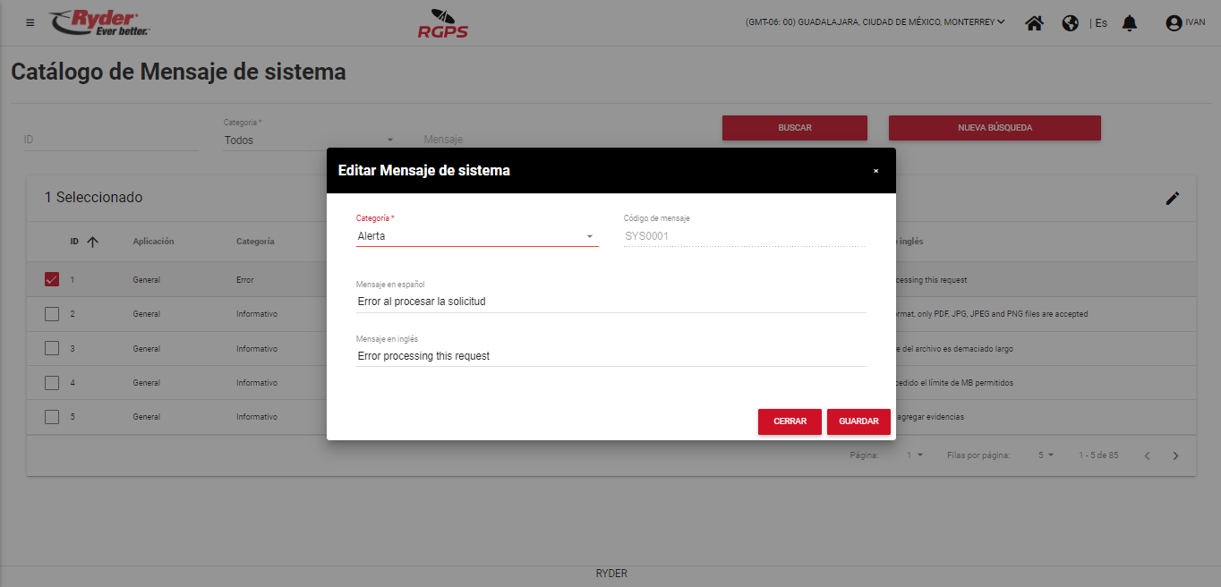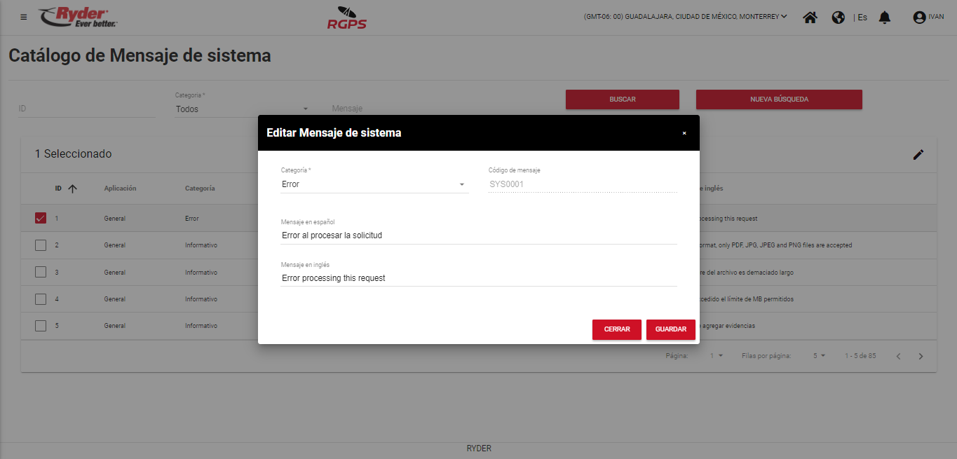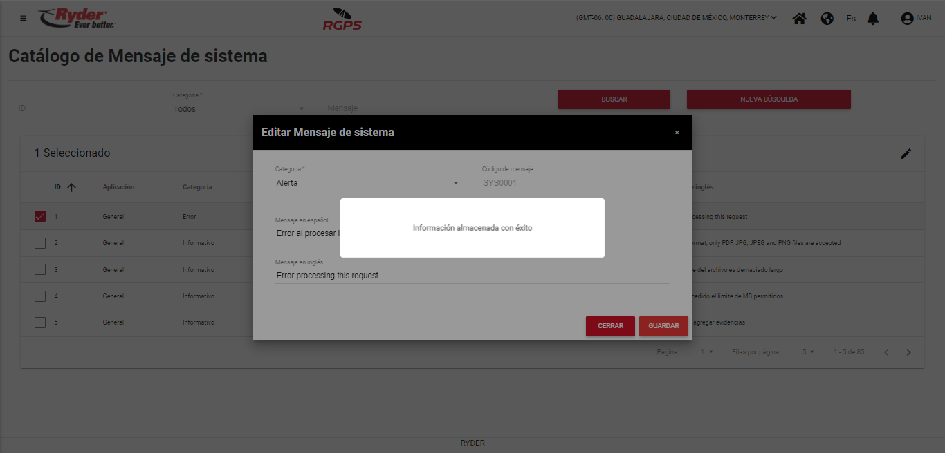 El mensaje desaparecerá de manera automática tras haber transcurrido un par de segundos y el usuario permanecerá en la pantalla “Catálogo de Mensaje de sistema”, en donde ya no se mostrará seleccionado el registro y se visualizará las modificaciones realizadas si es que el dato que se editó se encuentra en las columnas del grid.