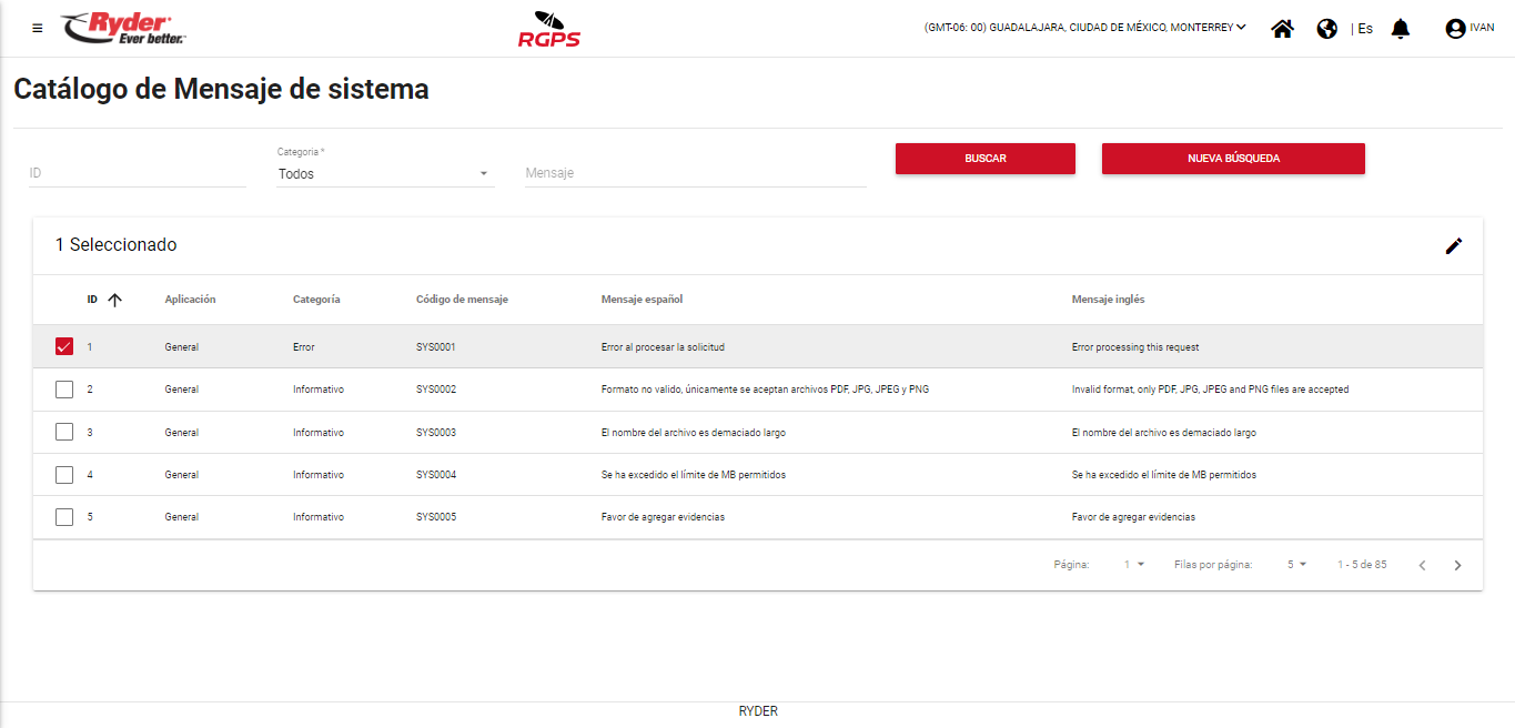 Al encontrarse en la pantalla “Catálogo de Mensaje de sistema” y haber aplicado una búsqueda, el usuario deberá habilitar la casilla del registro de su interés y se mostrarán del lado derecho de la tabla los iconos: Editar y Eliminar.