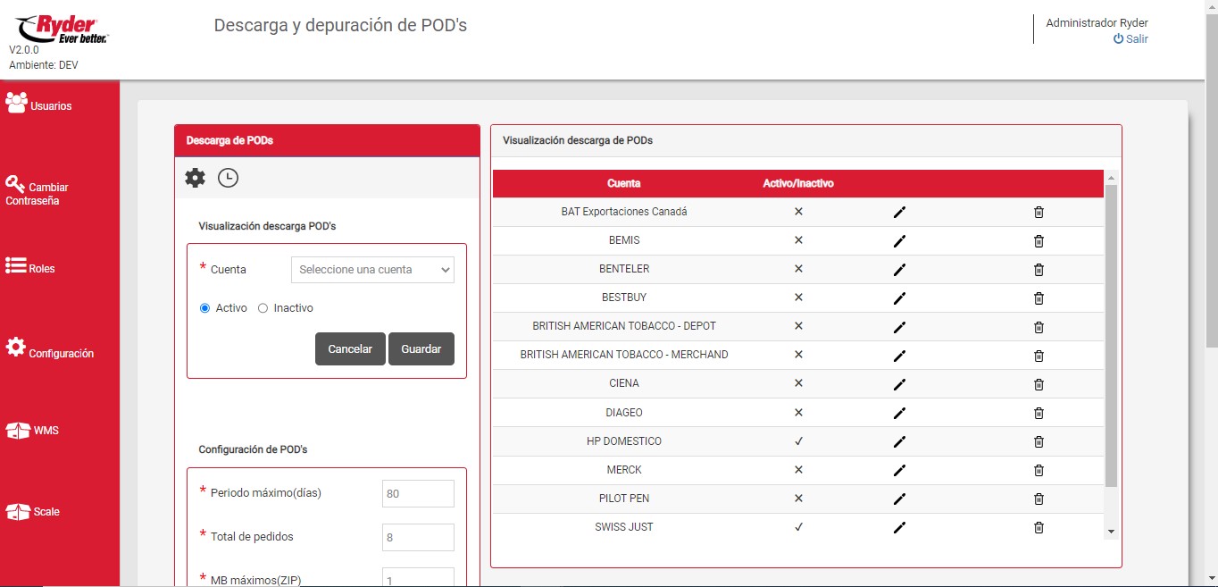 Del lado derecho se visualizará el listado de cuentas ordenadas por orden alfabético de A-Z que se encuentran configuradas para realizar la descarga de POD's en Track&Trace Web, mostrándose los datos siguientes: