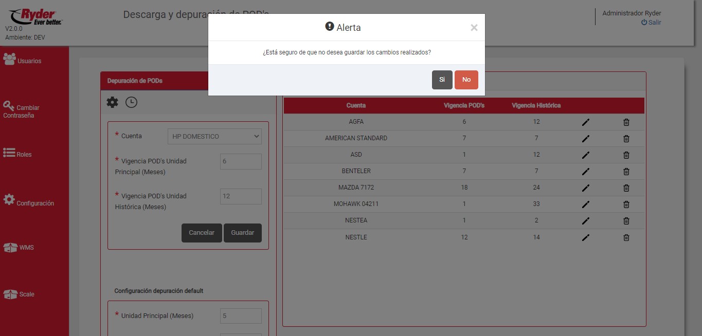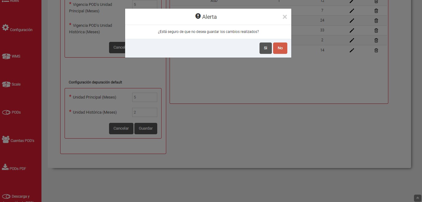 En caso de que el usuario no deseé realizar o concluir el agregar la nueva cuenta para depuración de POD's, deberá dar clic en el botón [Cancelar] se mostrará el siguiente mensaje de alerta: "¿Está seguro que no desea guardar los cambios realizados?"