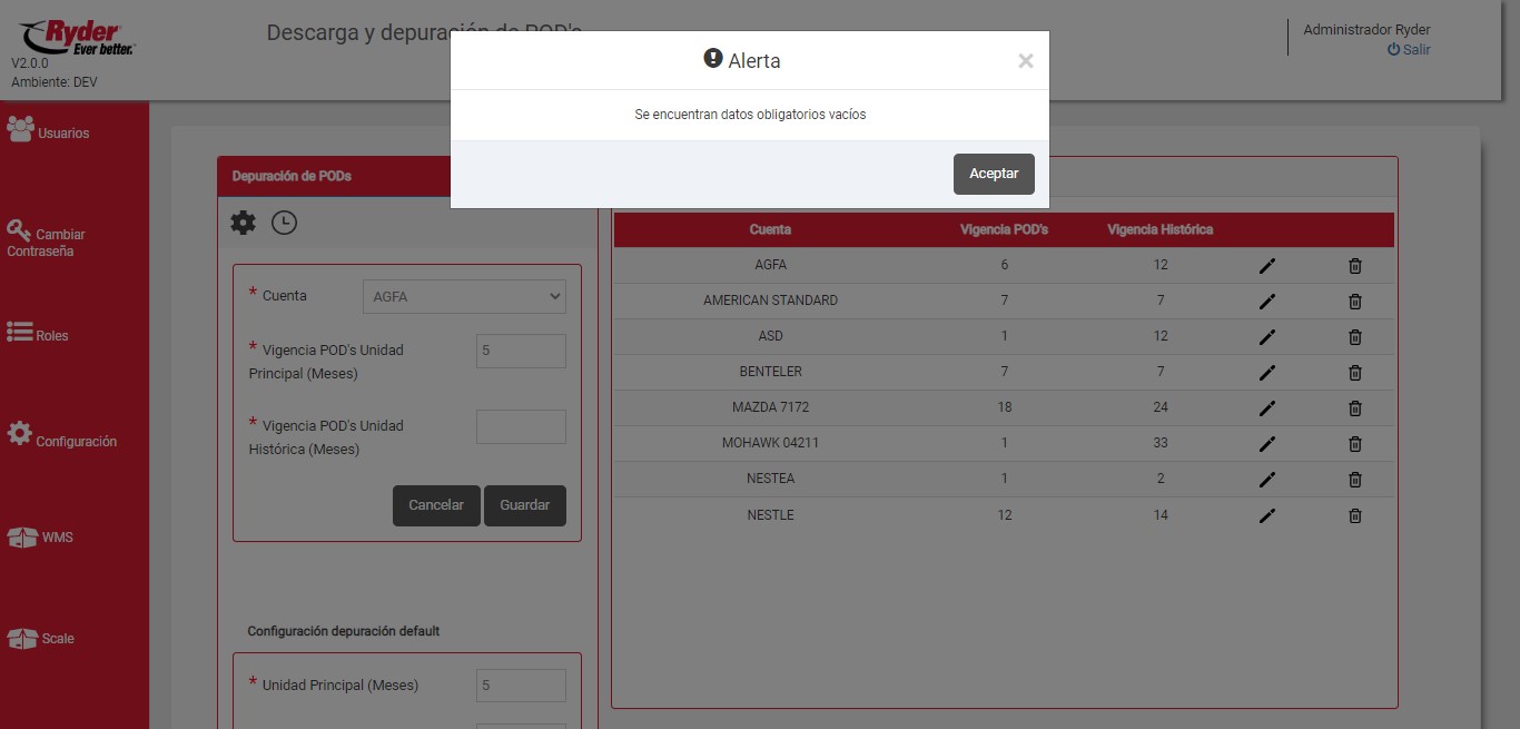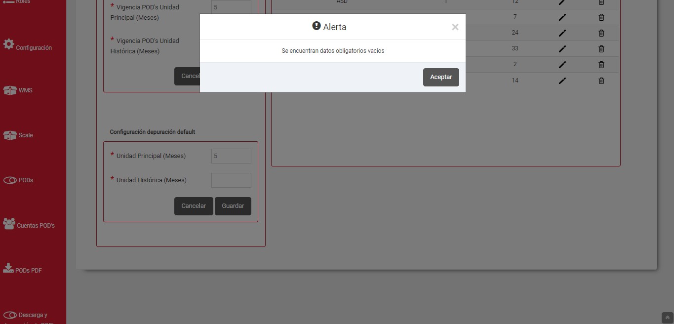 - *Unidad Principal (Meses). El usuario deberá posicionarse sobre dicho campo y capturarlo, el cual será un campo obligatorio y únicamente de tipo numérico el cual corresponderá al tiempo equivalente en meses en que las imágenes POD’s de cuentas no configuradas en consola para la depuración se almacenarán en la unidad principal, una vez transcurrido este tiempo, se moverán a la unidad de respaldo.