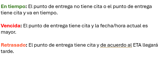 Amarillo: El tipo de unidad se encuentra en retraso de llegada al punto de entrega o cuenta con una fecha/hora de cita vencida y tiene una alerta asociada.