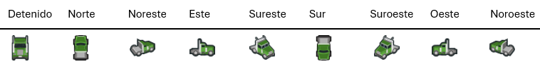 Verde: El tipo de unidad se encuentra en ruta o con un viaje asignado y tiene una alerta asociada con orientación al norte, noreste, este, sureste, sur, suroeste, oeste o noroeste.