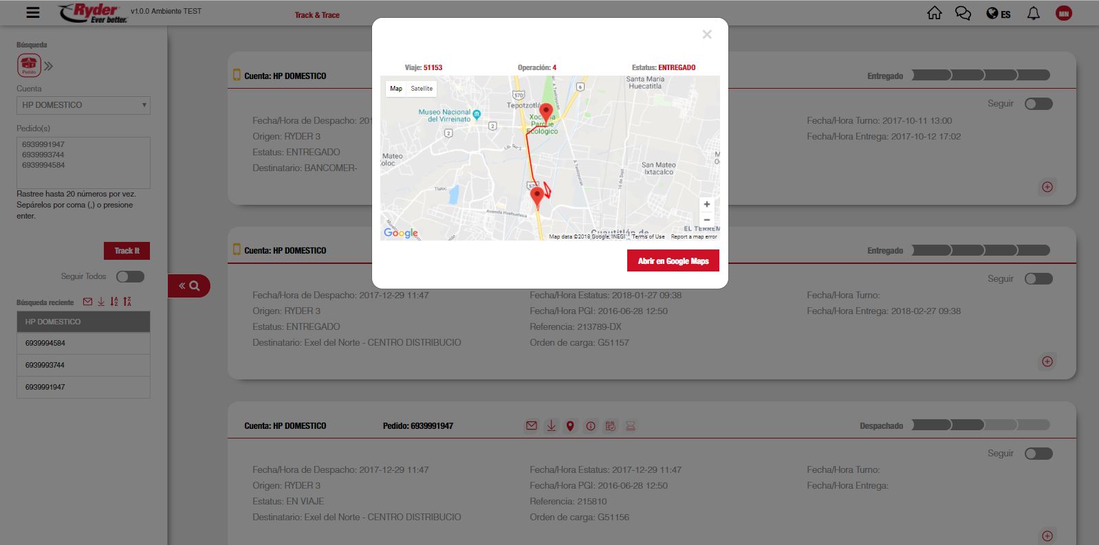 En caso de que el usuario desee manipular el tamaño del mapa, deberá dar clic en el botón [Abrir en Google Maps]. Se mostrará una ventana nueva en el navegador con el punto de destino del pedido.