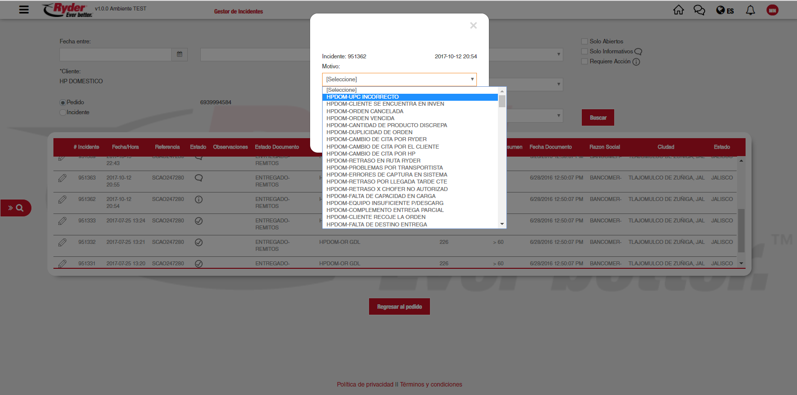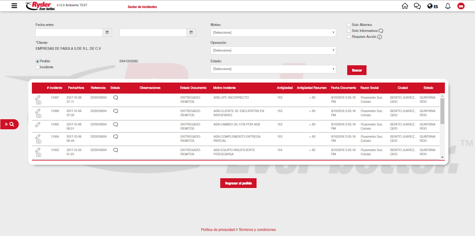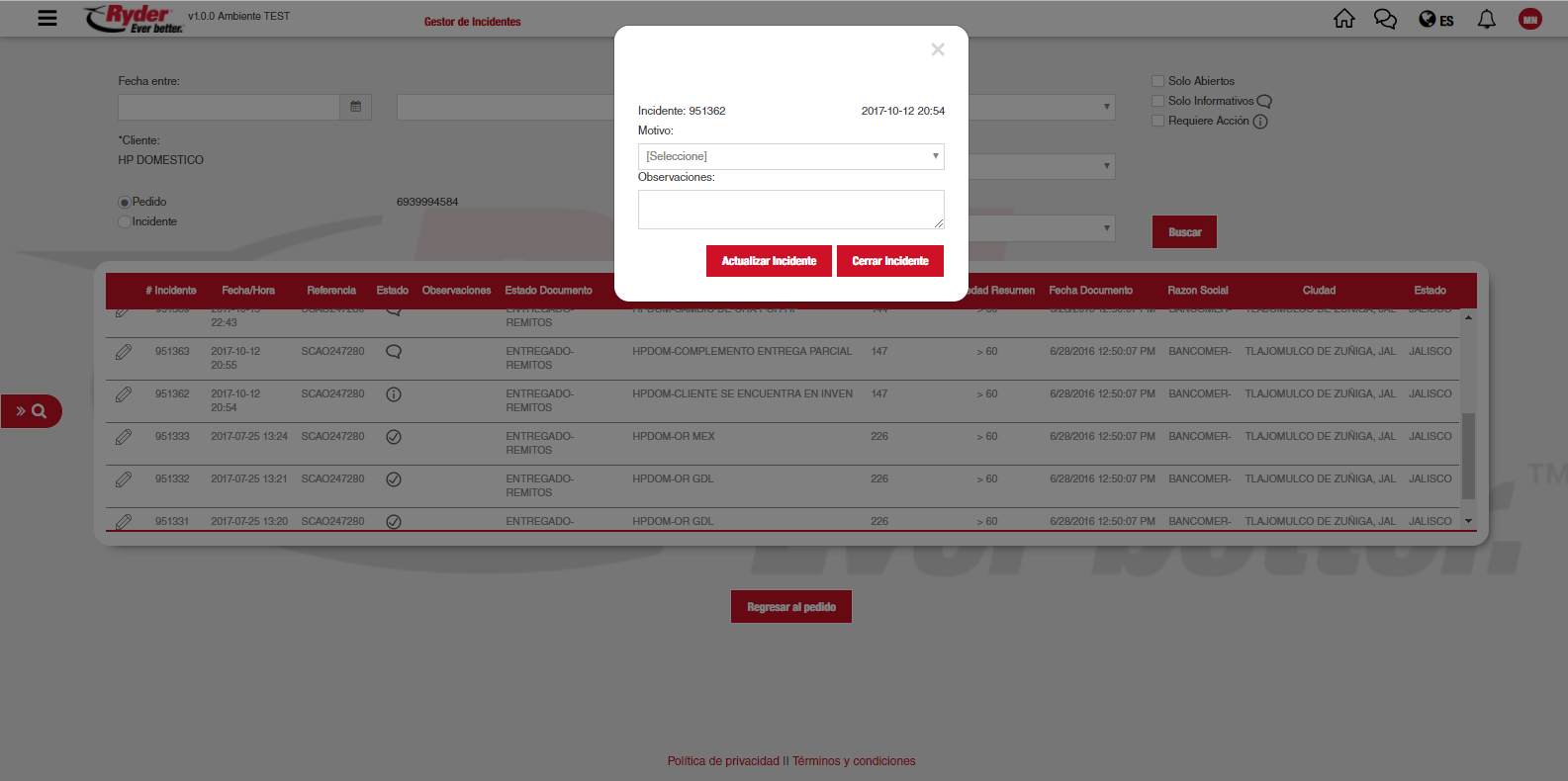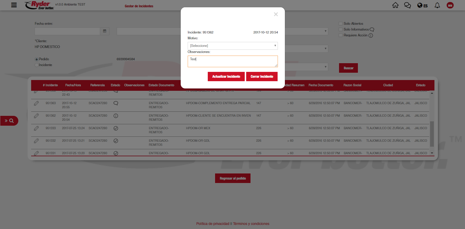 Dentro del Gestor de incidentes, el usuario podrá actualizar el incidente capturando observaciones y/o cerrando el incidente (siempre que tenga el permiso para hacerlo y el incidente no sea del tipo Informativo Ryder) haciendo clic en el icono de [Edición] de cada registro del listado de incidentes.
