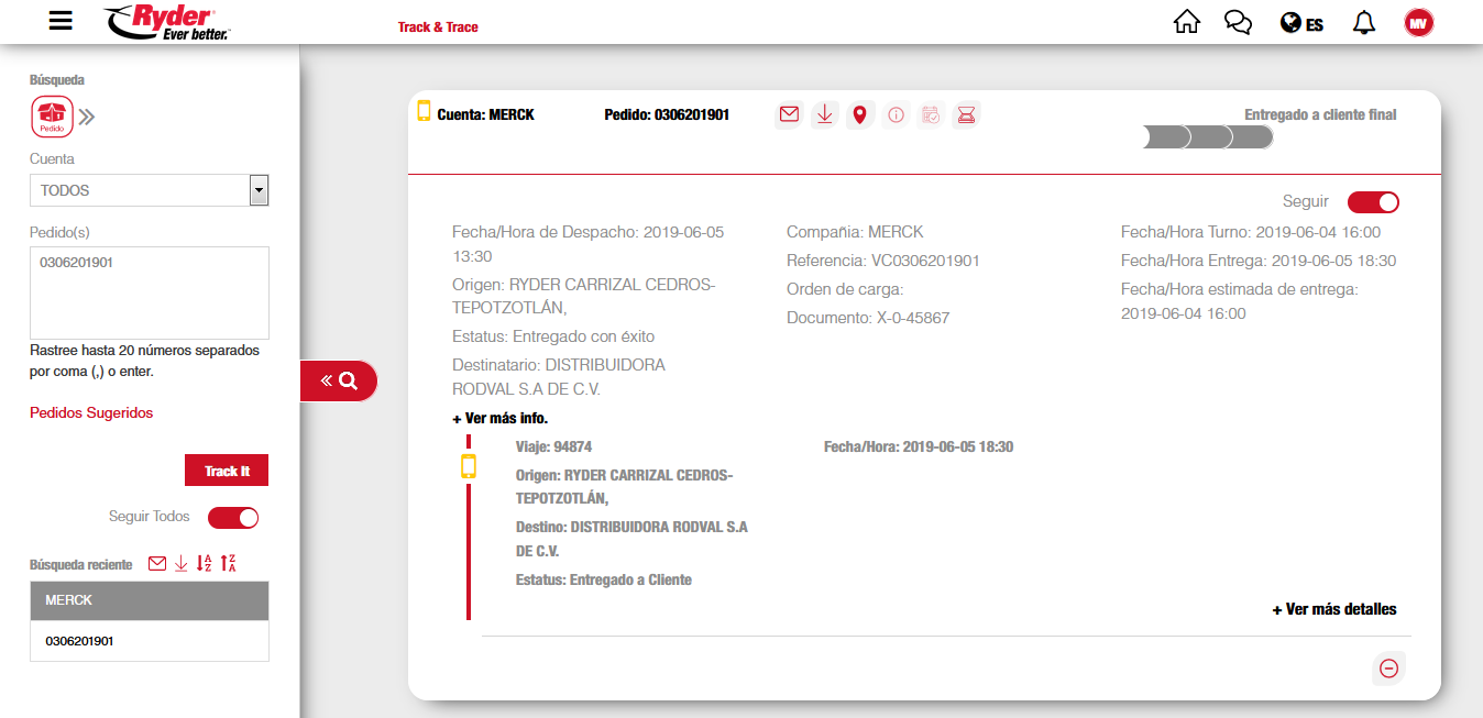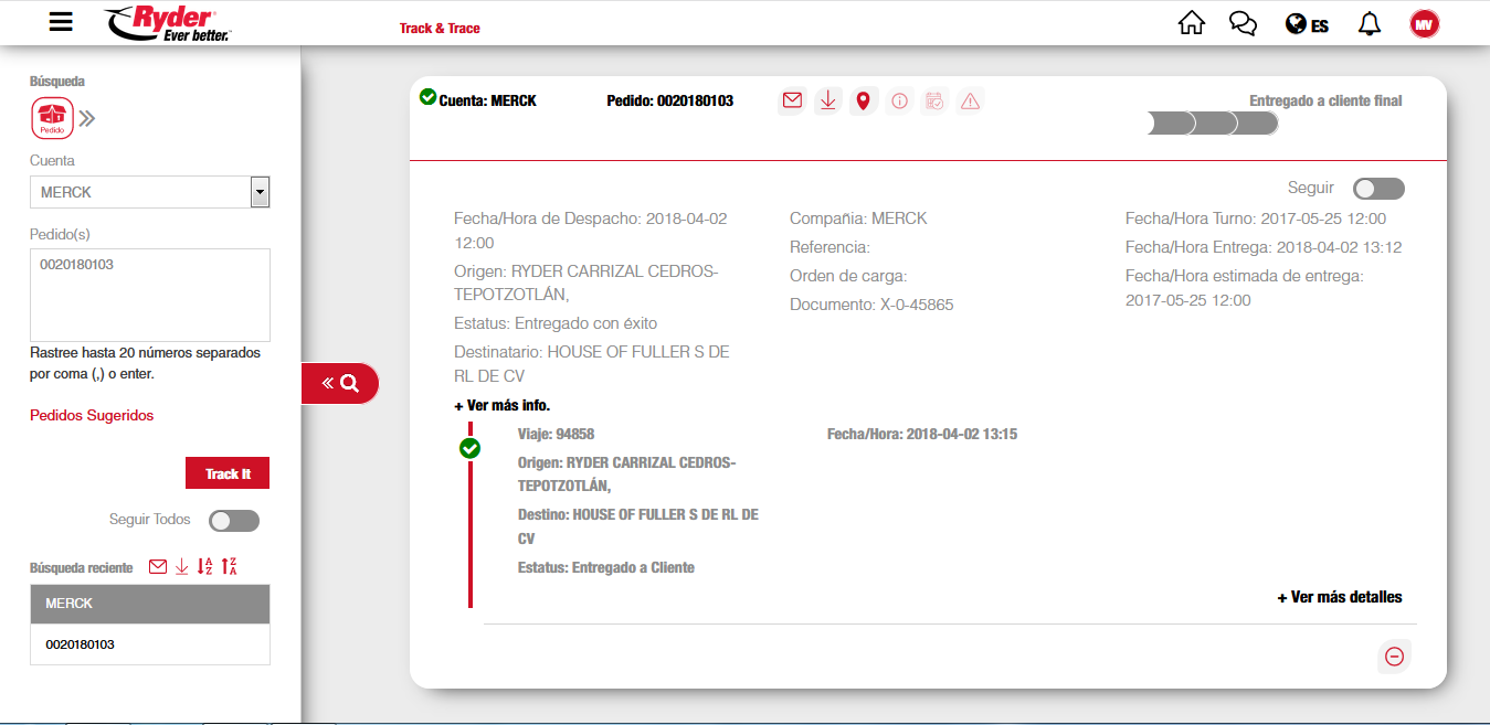 En caso de que el pedido cuente con estatus "Entregado" y todos sus viajes han sido "Rendidos", se mostrará el check mark verde en el pedido y en cada viaje.