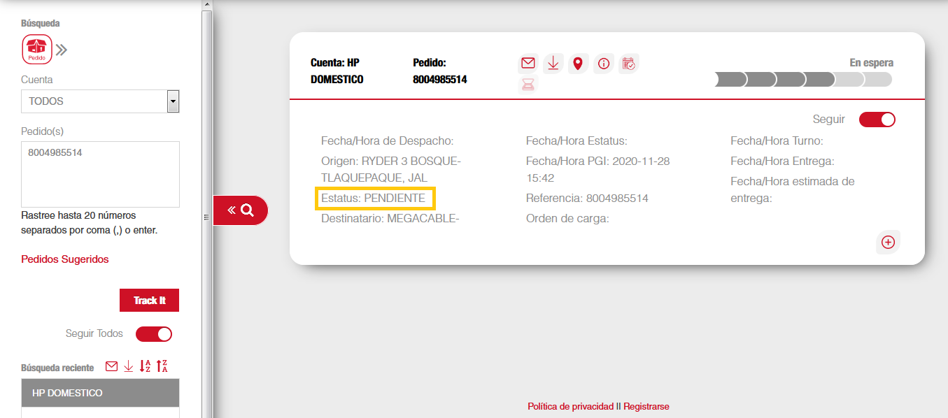 El usuario podrá visualizar el estatus de cada pedido en la ficha de pedido.