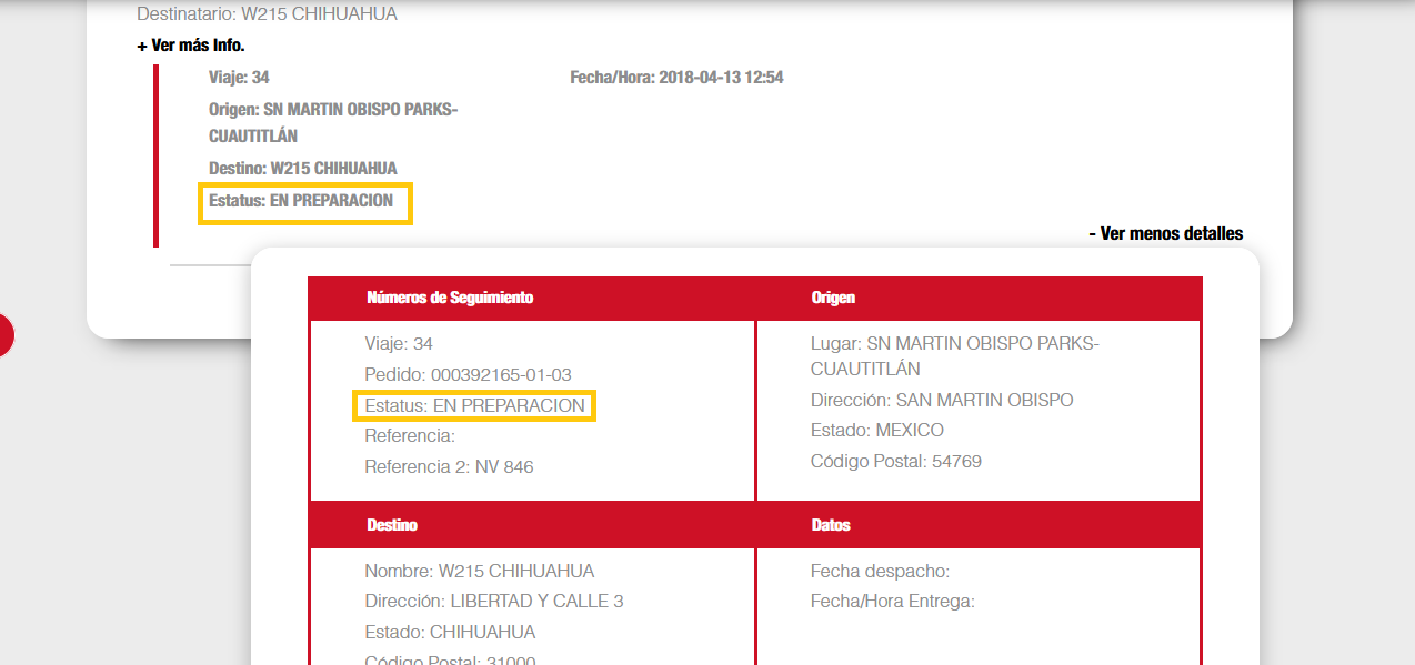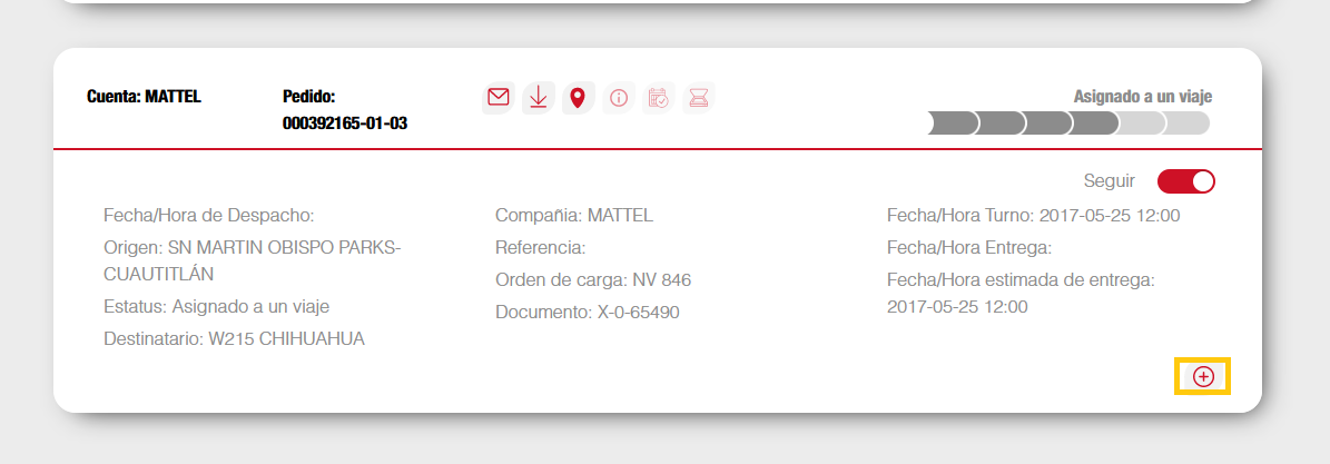 Para visualizar el estatus de viaje de un pedido, el usuario deberá acceder a la sección de detalle de viaje de cada ficha dando clic al botón ["+"] que se encuentra en la esquina inferior derecha: