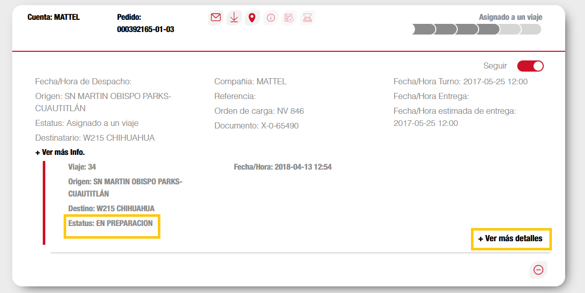 Si la cuenta del pedido solo tiene configurado TMS (transportation management system), el usuario podrá visualizar una barra con 3 segmentos en la esquina superior derecha de la ficha de su pedido.