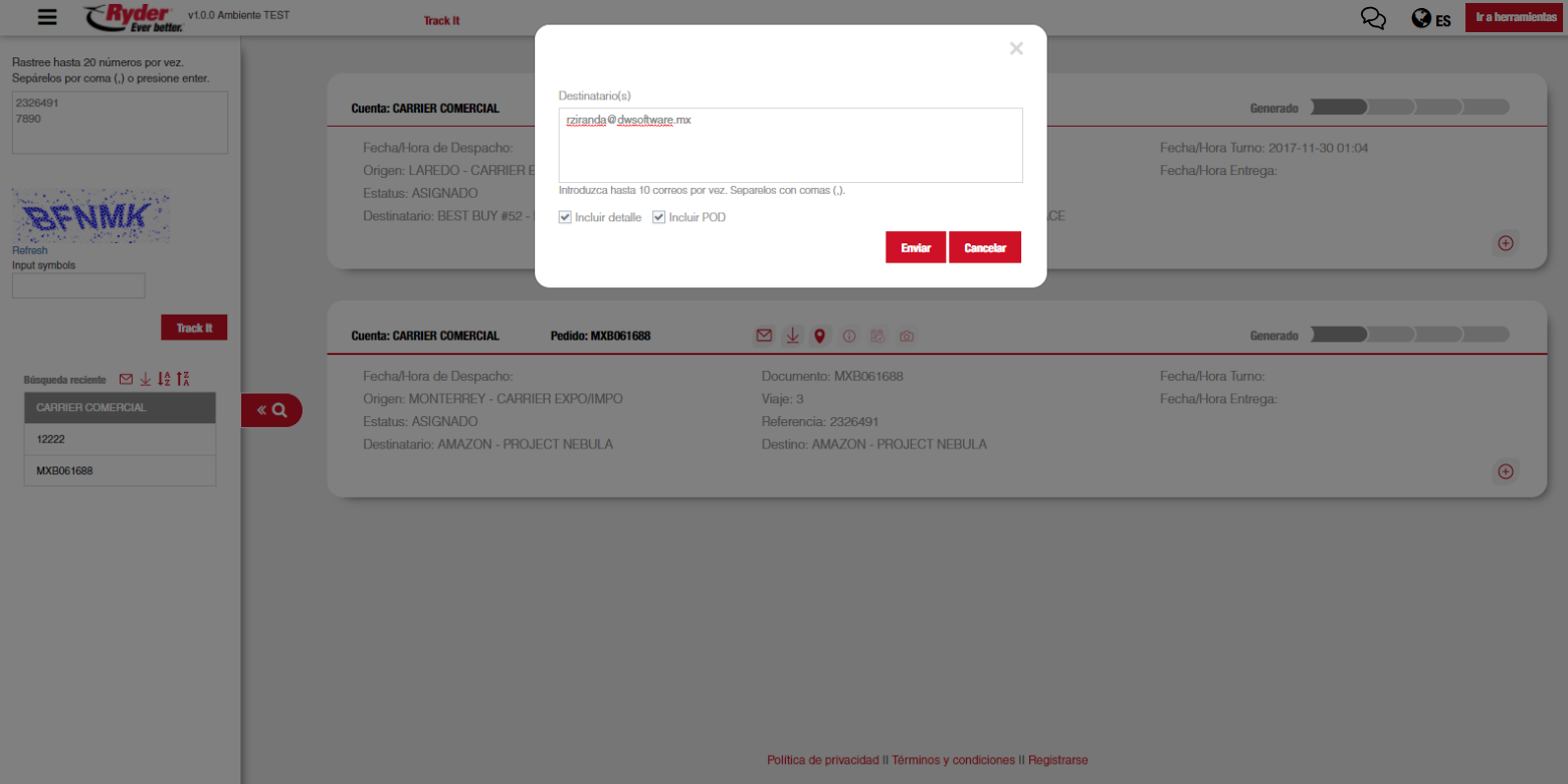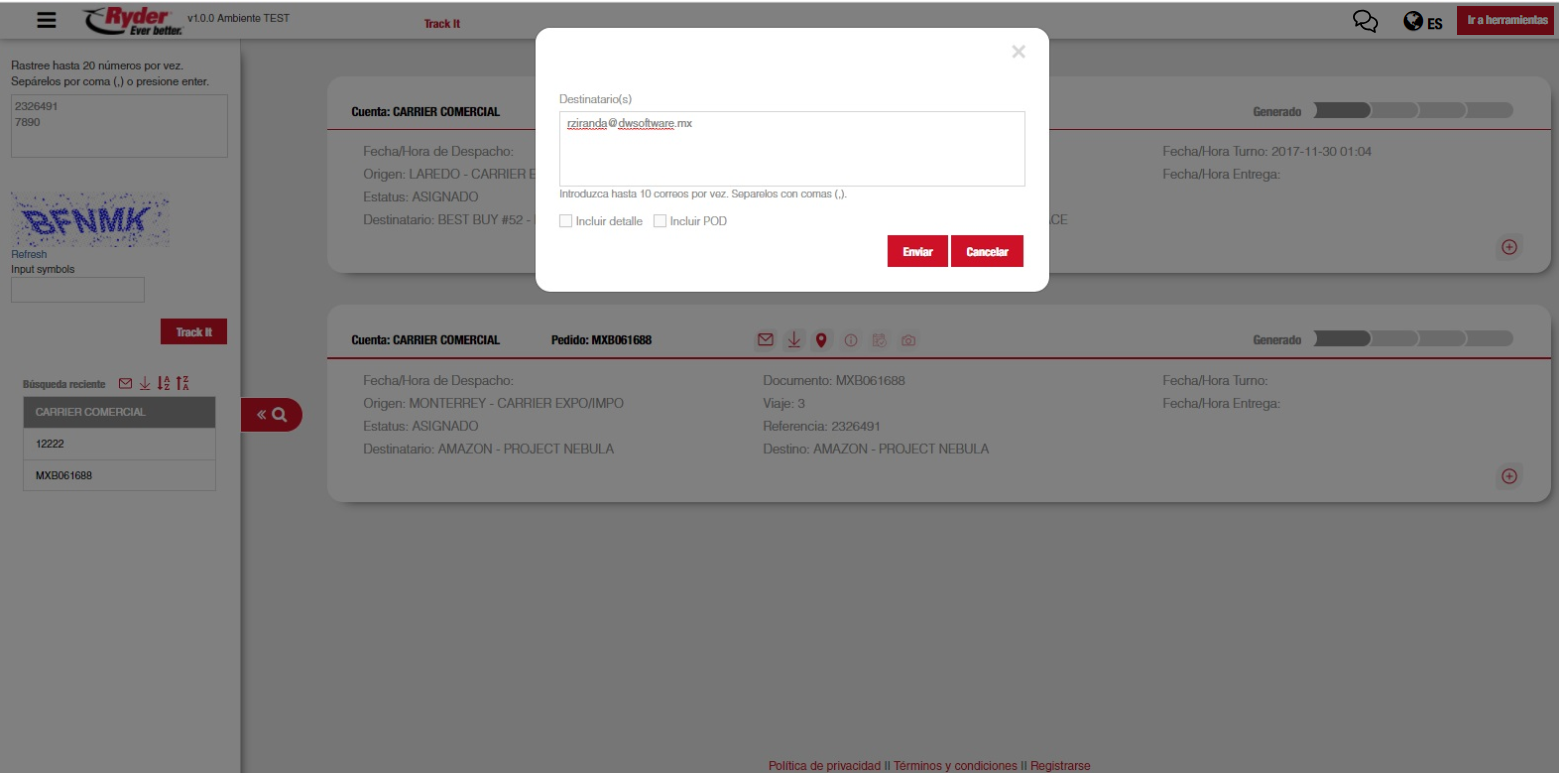 El usuario deberá realizar la captura del correo electrónico de los destinatarios los cuales deberán ser separados por comas.
