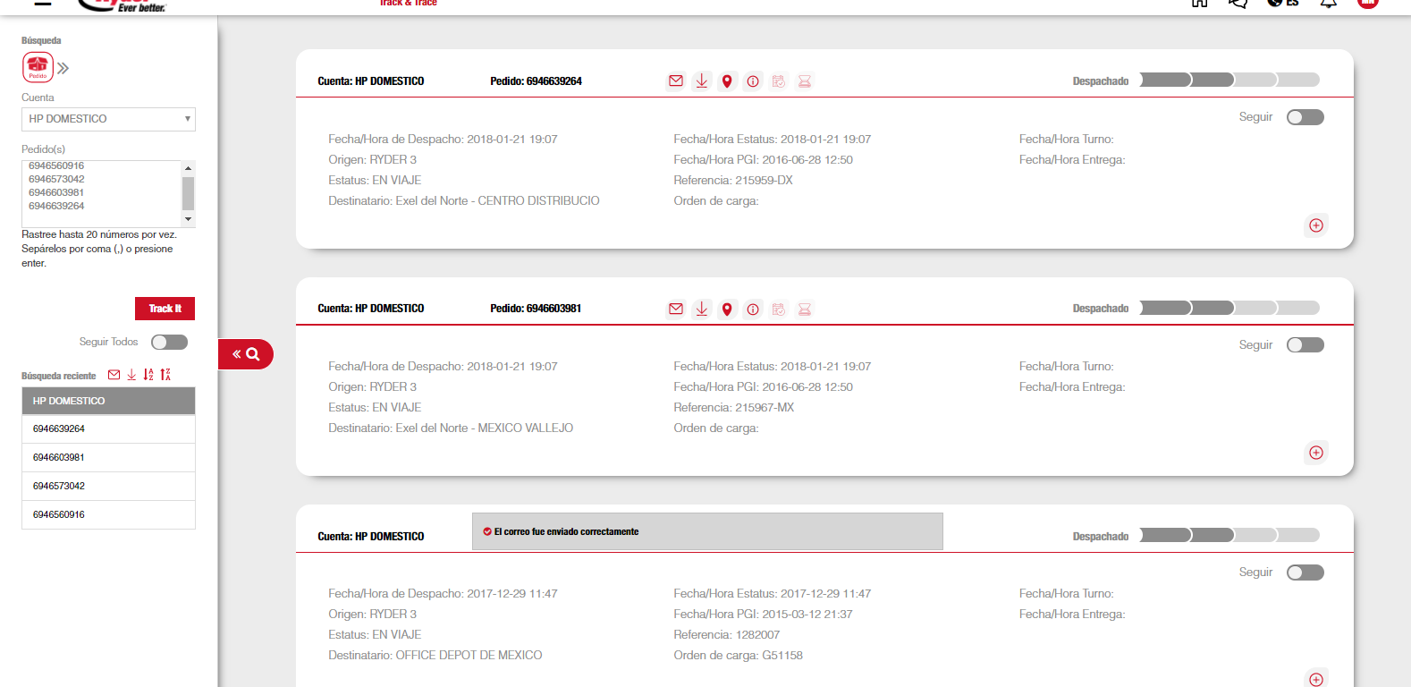 Una vez que el usuario finaliza los pasos anteriores deberá dar clic sobre el botón [Enviar] y se mostrará el siguiente mensaje de confirmación: "El coreo fue enviado correctamente" el cual permanecerá visible por 3 segundos. En caso de no desear enviar el correo electrónico, el usuario deberá dar clic en el botón [Cancelar] y se mostrará la pantalla con la consulta de pedidos.