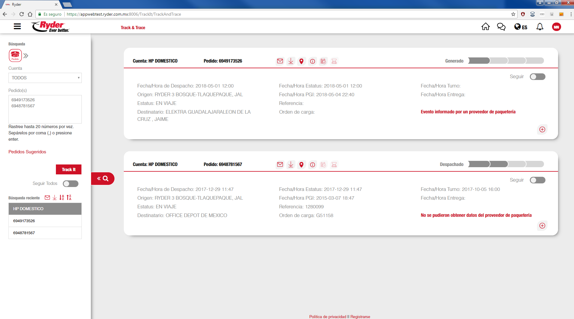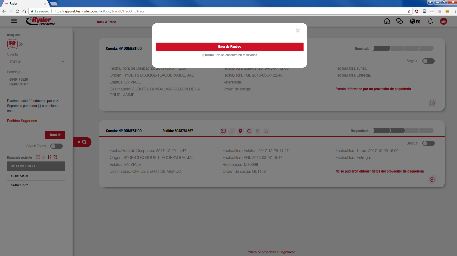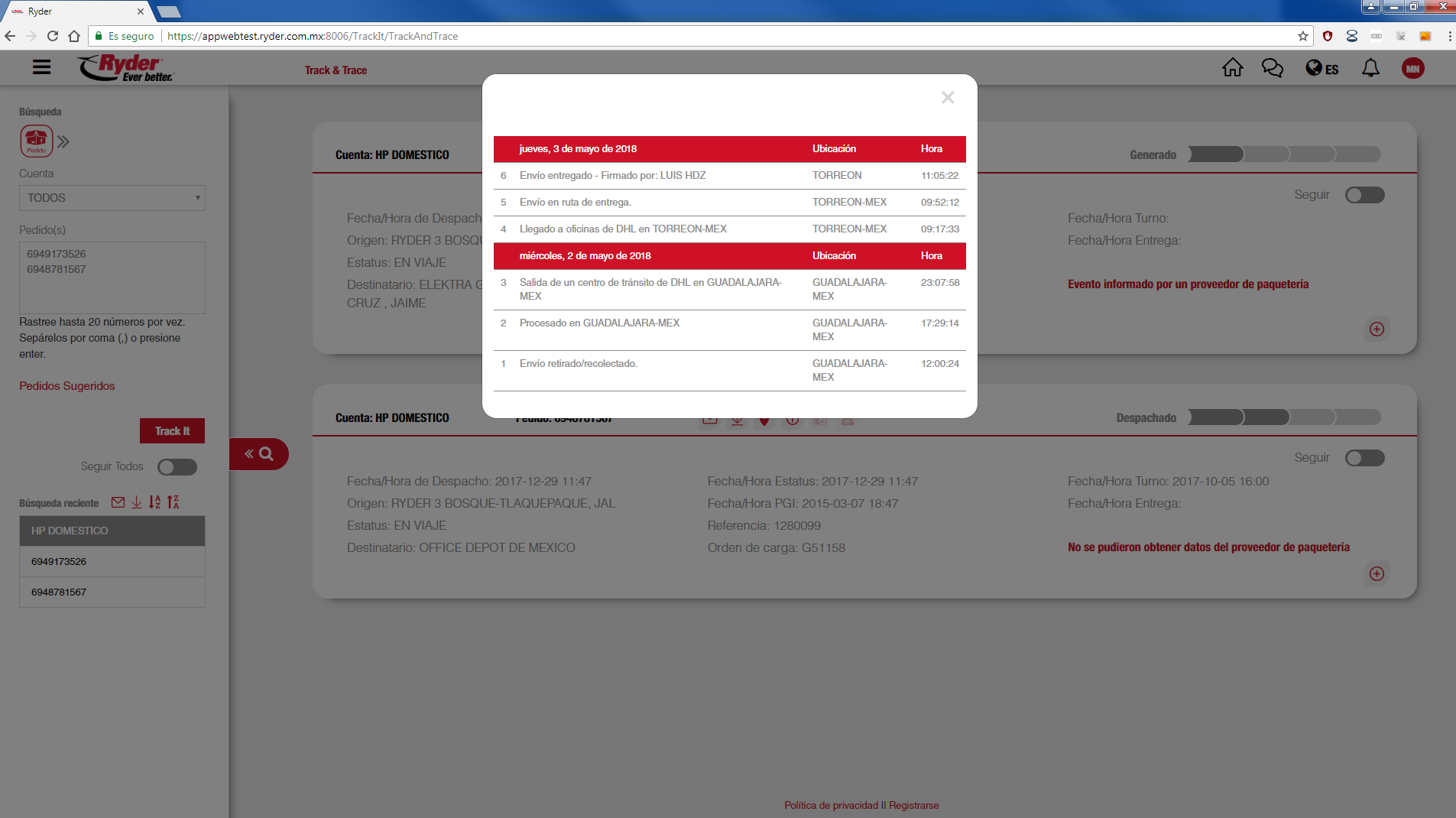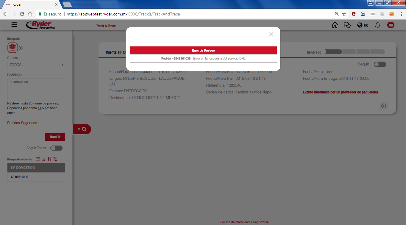 En caso de que no se pueda obtener la información del proveedor de paquetería, se mostrará la leyenda "Error en la respuesta del servicio DHL".
