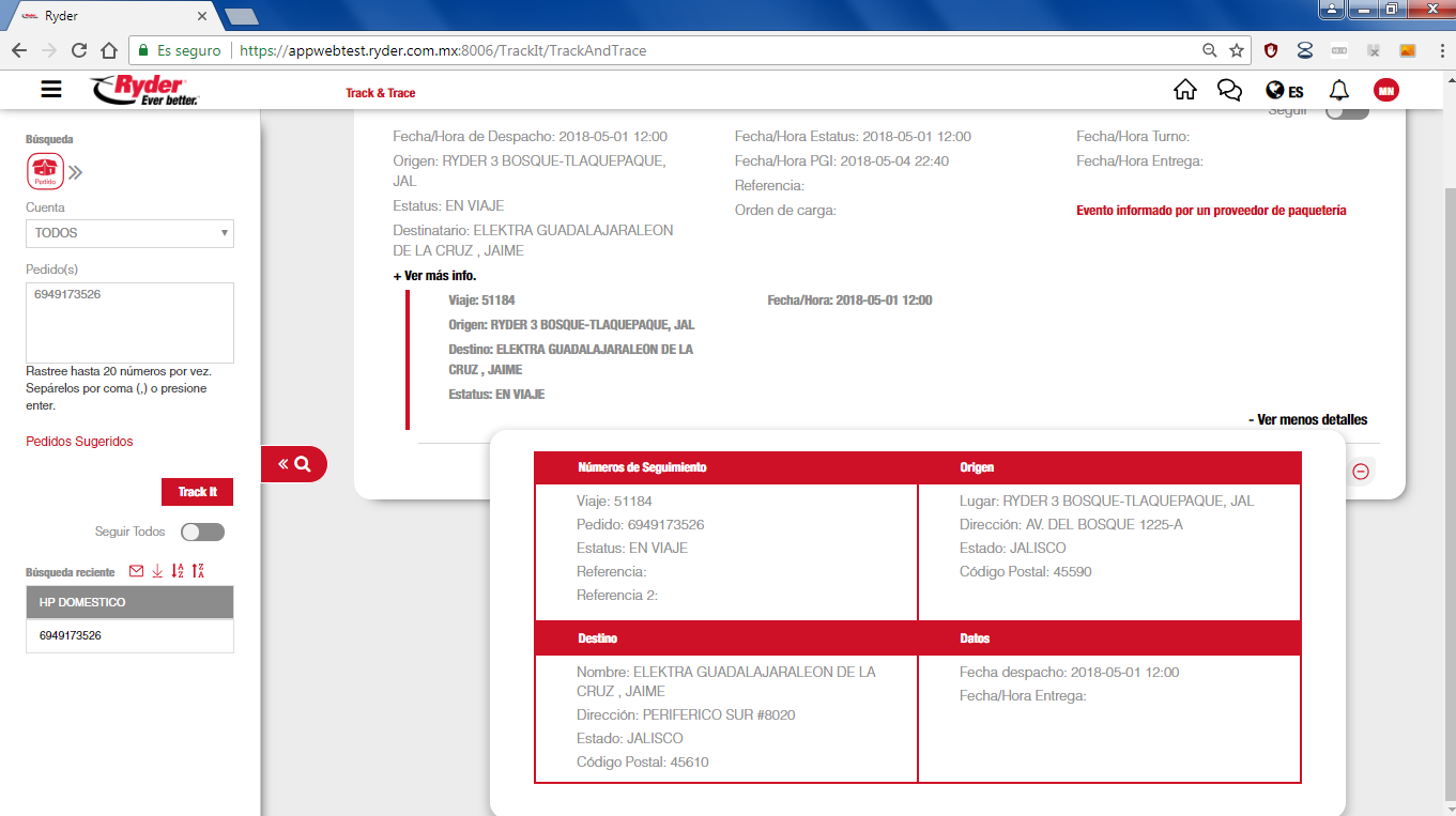 • En caso de que el usuario desee visualizar la información perteneciente a Ryder, deberá expandir la ficha del pedido y dar clic en la opción "+ Ver más detalles", visualizándose una pantalla que contendrá la información detallada. Si el usuario desea cerrar la pantalla, deberá dar clic sobre el icono "X" y se mostrará la pantalla de información del pedido, segmento DHL y viajes.