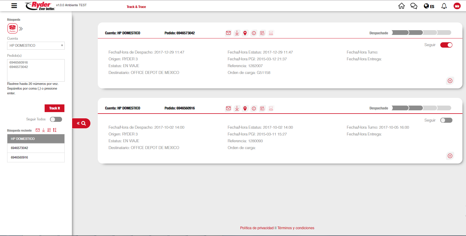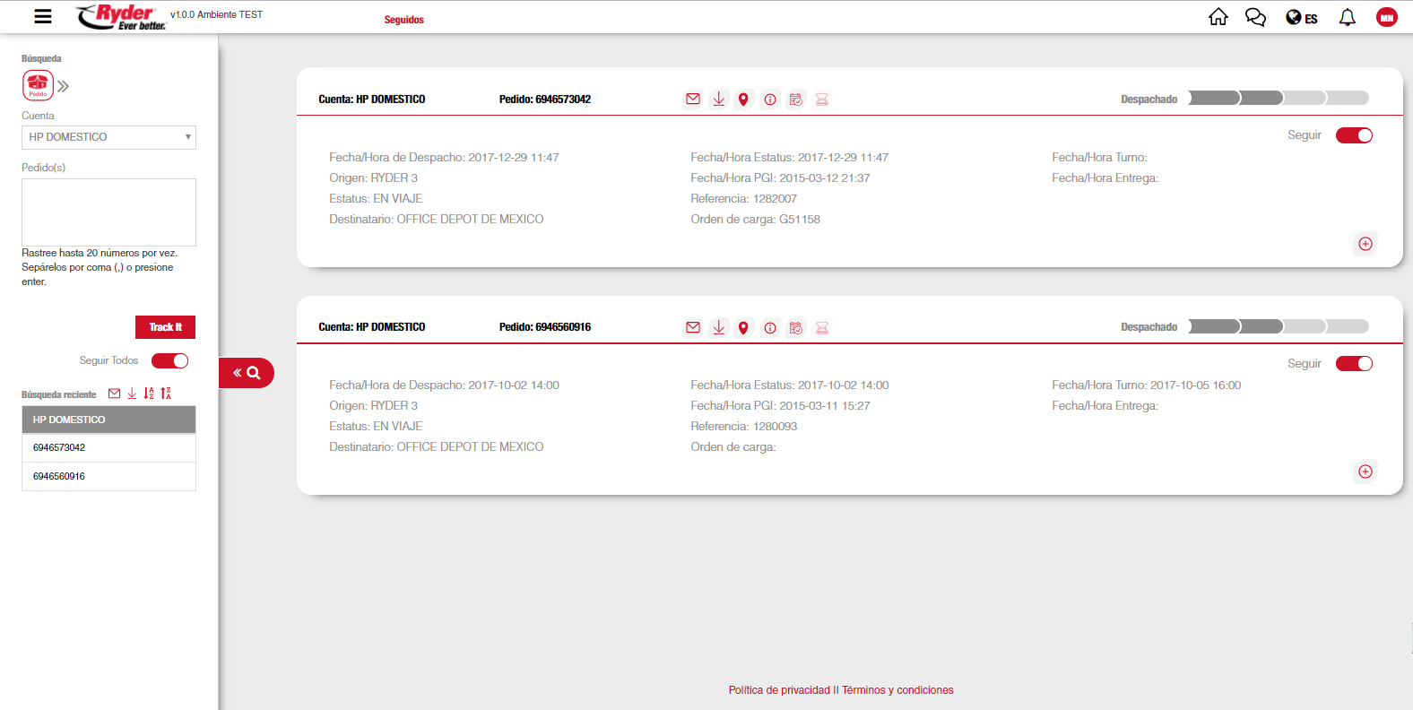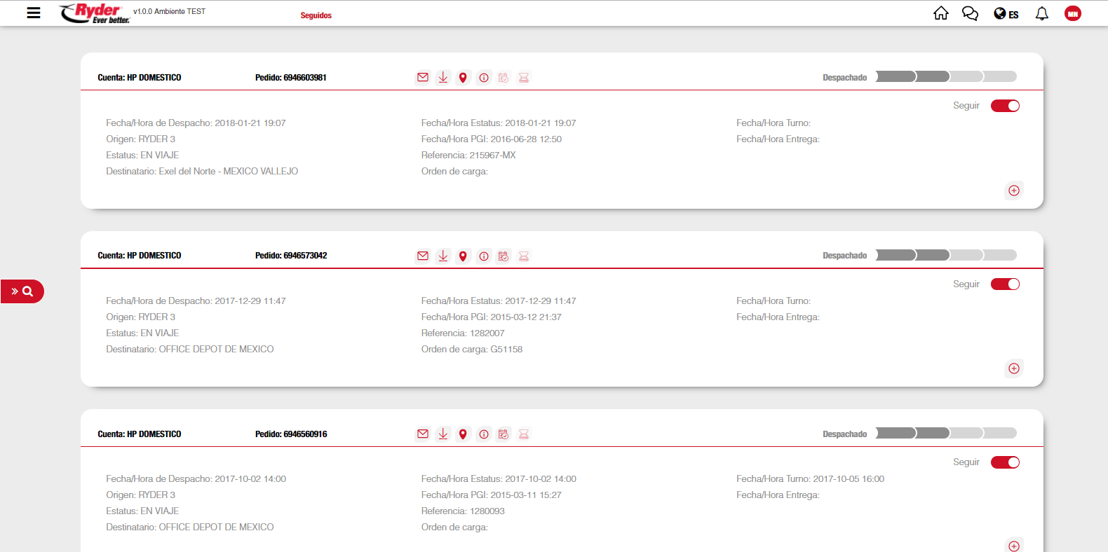 Mostrándose los pedidos seguidos manual o automáticamente donde se visualizará el switch "Seguir" encendido para dichos pedidos, donde el usuario tendrá acceso a cualquiera de las acciones de visualizar el mapa del pedido, consultar sus incidentes, consultar sus eventos, consultar las pruebas de entrega (POD), consultar el resto de la información relacionada con el pedido, compartir dicha información por correo, descargar el PDF del pedido, opción de seguir el pedido y visualizar sus viajes y acceder a las funciones propias de dichos viajes.