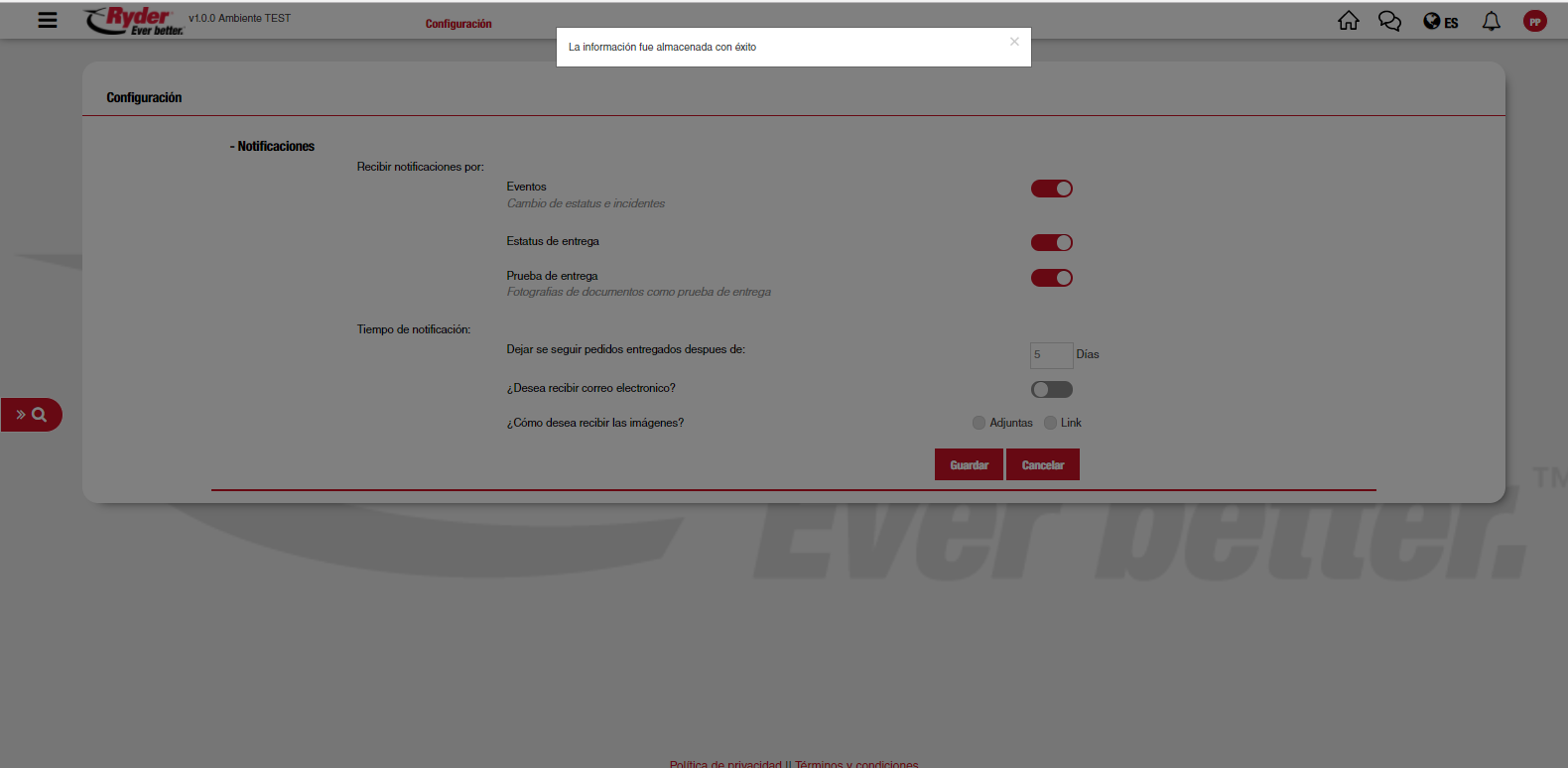 • Prueba de entrega (Fotografías de documentos como prueba de entrega) donde se habilitará la sección "Notificaciones POD".