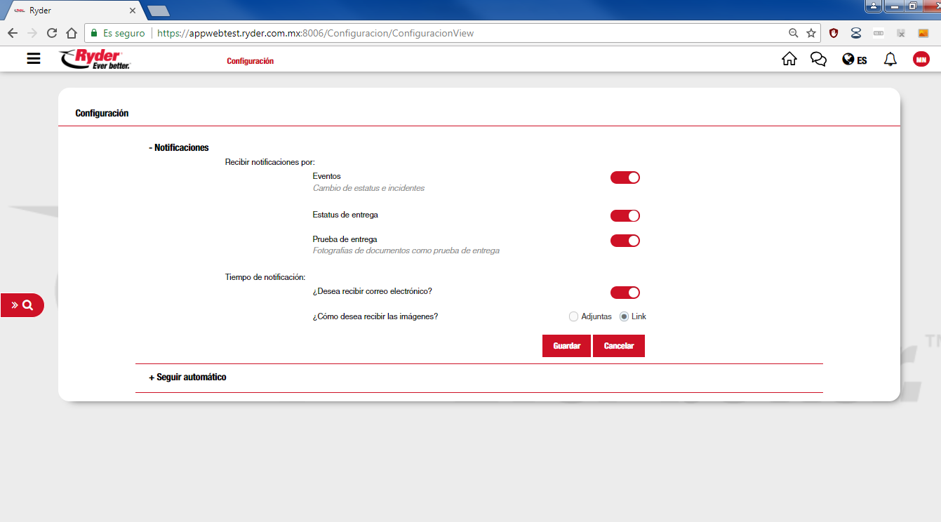 • En caso de que el usuario active el switch de: "¿Desea recibir correo electrónico?", se activará la opción para indicar como desea recibir las imágenes POD y el usuario deberá seleccionar si desea recibirlas "Adjuntas" o por un "Link"