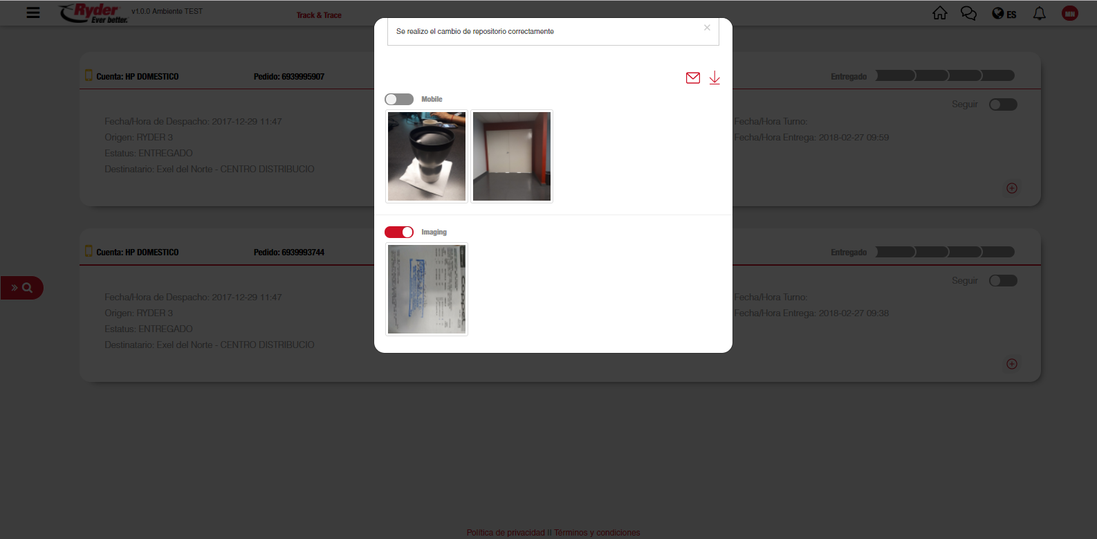Los switches de los repositorios serán excluyentes, solo uno de los dos puede estar encendido (Al encender un switch, el otro estará apagado). El usuario podrá seleccionar el repositorio que desee en cualquier momento, sin importar el estatus del pedido del que estén relacionadas las imágenes.