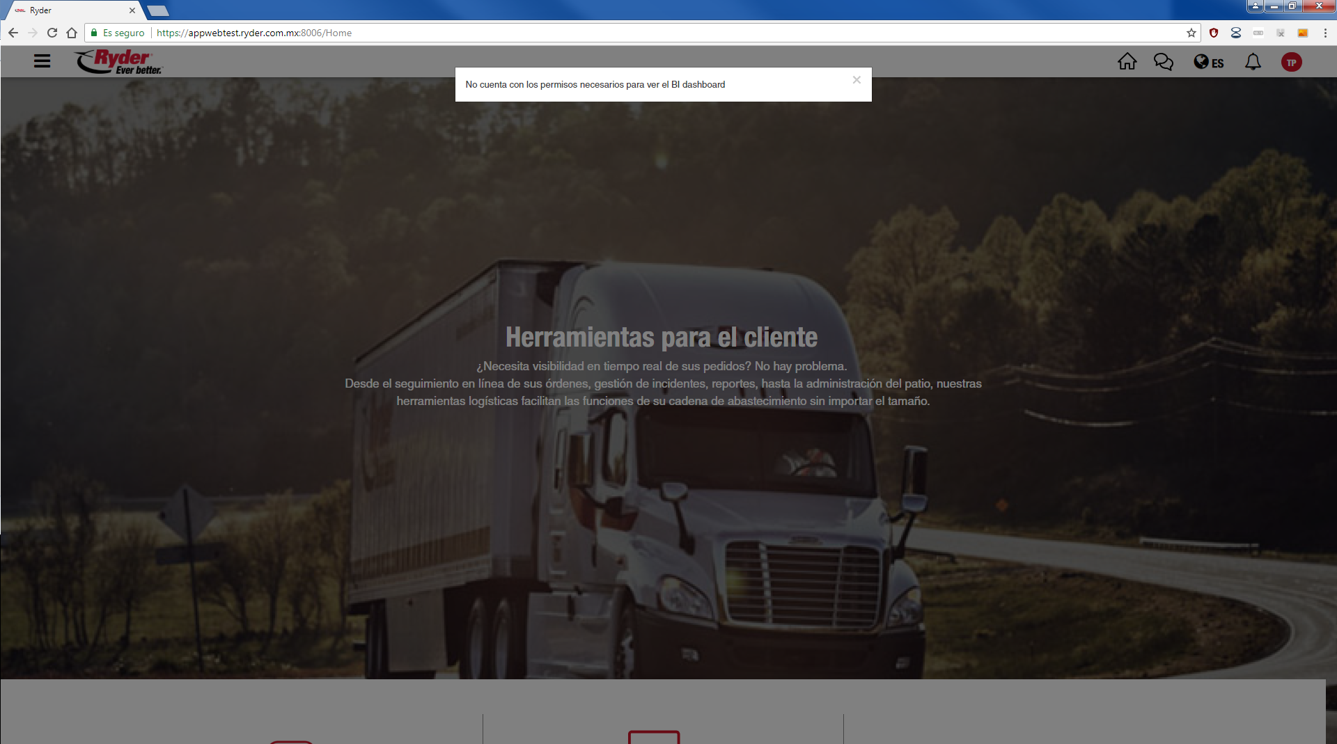 Es necesario que el usuario autenticado tenga permisos para acceder a "Tablero BI", si no cuenta con ellos, se mostrará el mensaje "No cuenta con los permisos necesarios para ver el BI dashboard".