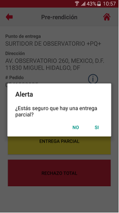 •        Si el chofer o transportista desea continuar con la pre-rendición de entrega parcial deberá presionar el botón [Si] y esta acción valida: