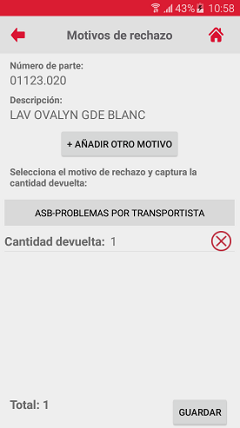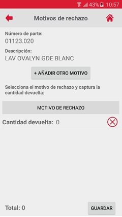 Una vez que el chofer o transportista visualiza la pantalla Entrega Parcial, deberá presionar el número de parte de su interés y esta acción mostrará la pantalla Motivos de rechazo.