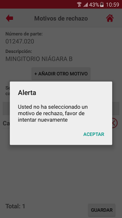 •        Si no existe un renglón que no contiene un motivo de rechazo seleccionado, se mostrará el siguiente mensaje: