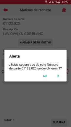 •        Si el chofer o transportista desea ya no agregar más motivos de rechazo y cantidad devuelta al mismo número de parte, deberá presionar el botón [Si] y esta acción mostrará el siguiente mensaje: