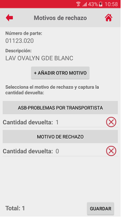 •        El chofer o transportista podrá agregar más motivos de rechazo para ese número de parte, para ello deberá dar clic en el botón [+Añadir otro motivo] y dicha acción agrega otro renglón para indicar el motivo de rechazo y la cantidad devuelta.