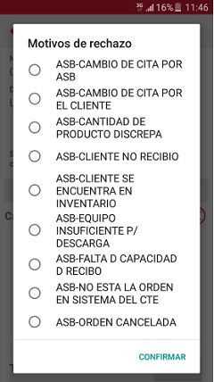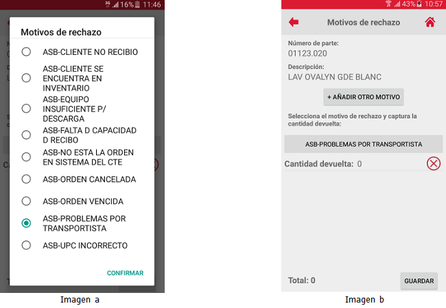 El chofer o transportista deberá seleccionar un motivo de rechazo, posteriormente deberá presionar el botón [Confirmar] (Imagen a) y esta acción mostrará de nuevo la pantalla Motivos de Rechazo donde se visualiza el motivo seleccionado (Imagen b).