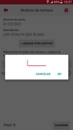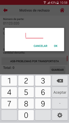 El chofer o transportista podrá capturar la cantidad rechazada de ese número de parte, para ello deberá presionar donde se visualiza el número de cantidad devuelta, esta acción mostrará una pantalla para capturar la cantidad.