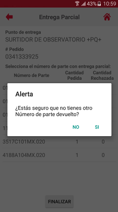 Una vez que el chofer o transportista visualiza la pantalla Motivos de Rechazo con la cantidad devuelta por número de parte, deberá presionar el botón [Finalizar] y dicha acción mostrará el siguiente mensaje: