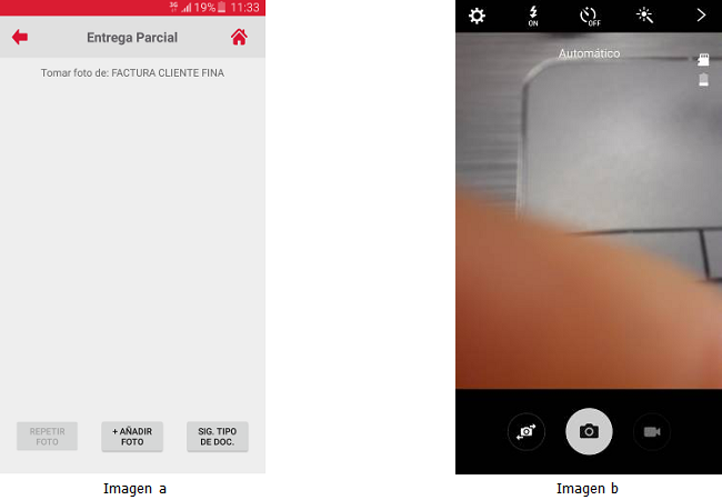 •        Si el chofer o transportista desea finalizar con la entrega parcial, y no tiene habilitada la pre-rendición entrega parcial por detalle (POD Digital), deberá presionar el botón [Si], dicha acción mostrará la pantalla que indica el tipo de documento a capturar un par de segundos (Imagen a) y posteriormente se mostrará la pantalla donde podrá realizar la captura de fotografías por tipo de documento (Imagen b).