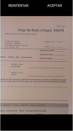 El chofer o transportista podrá hacer zoom, activar el flash, entre otros controladores de la cámara. Después el chofer o transportista deberá presionar el botón de la cámara y esta acción tomará una fotografía pre-visualizándola junto con dos botones: