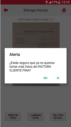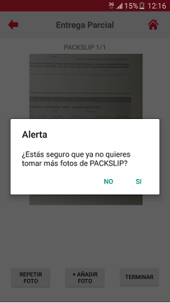 •        Si el chofer o transportista no desea terminar de capturar fotografías, deberá presionar el botón [No] y esta acción mostrará la pantalla Entrega Parcial donde se visualiza la última fotografía del último tipo de documento de prueba de entrega.