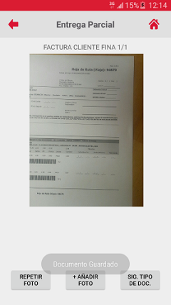 •        Si el chofer o transportista presiona el botón [Si], esta acción mostrará la pantalla donde se visualiza el tipo de documento, un par de segundo después se mostrará la pantalla de cámara para la captura de fotografías para un nuevo tipo de documento de prueba de entrega.